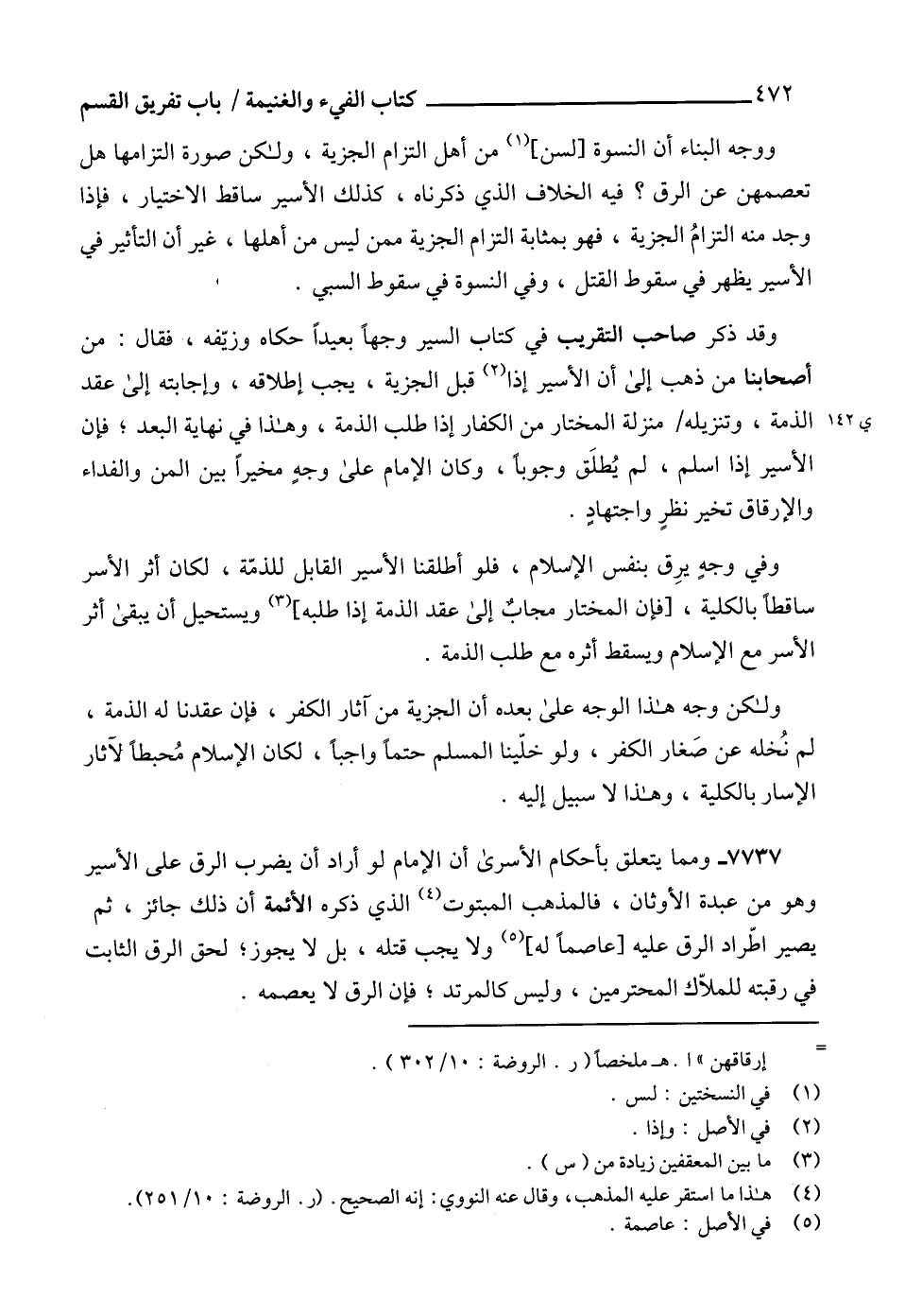 7737 - ومما يتعلق بأحكام الأسرى أن الإمام لو أراد أن يضرب الرق على الأسير وهو من عبدة الأوثان، فالمذهب المبتوت (4) الذي ذكره الأئمة أن ذلك جائز، ثم يصير اطّراد الرق عليه [عاصماً له] (5) ولا يجب قتله، بل لا يجوز؛ لحق الرق الثابت في رقبته للملاّك المحترمين، وليس كالمرتد؛ فإن الرق لا يعصمه.