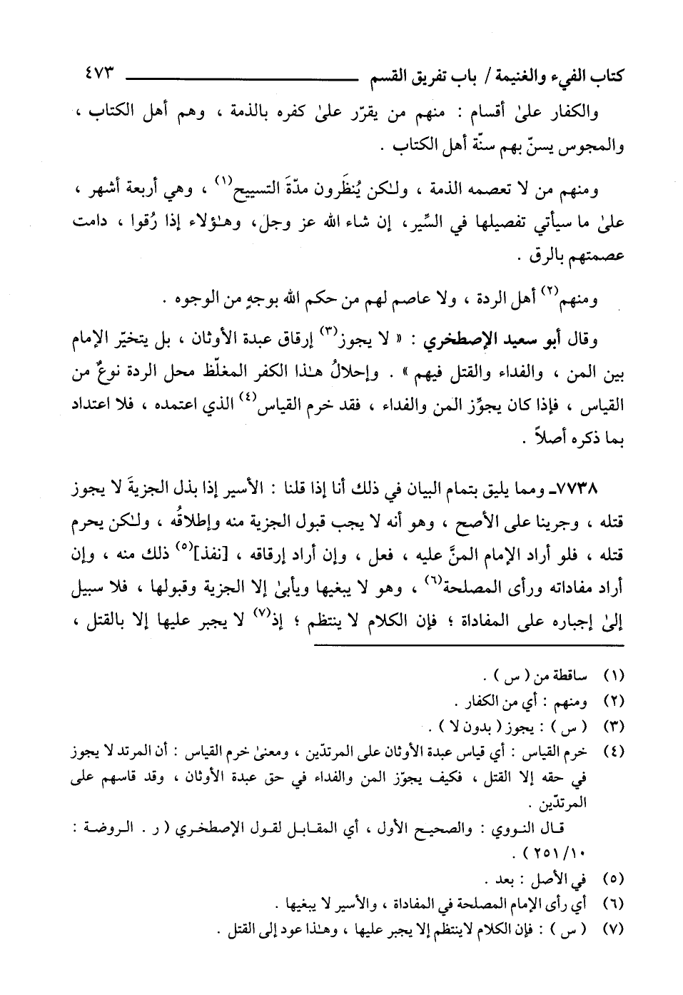 (4) خرم القياس: أي قياس عبدة الأوثان على المرتدّين، ومعنى خرم القياس: أن المرتد لا يجوز في حقه إلا القتل، فكيف يجوّز المن والفداء في حق عبدة الأوثان، وقد قاسهم على المرتدّين.