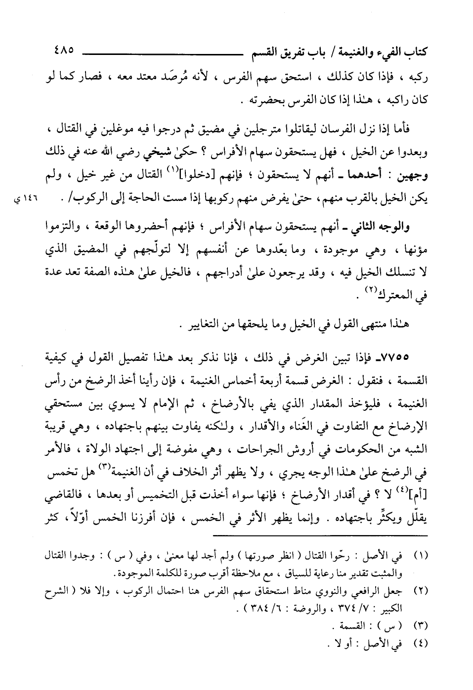 والوجه الثاني - أنهم يستحقون سهام الأفراس؛ فإنهم أحضروها الوقعة، والتزموا مؤنها، وهي موجودة، وما بعّدوها عن أنفسهم إلا لتولّجهم في المضيق الذي لا تنسلك الخيل فيه، وقد يرجعون على أدراجهم، فالخيل على هذه الصفة تعد عدة في المعترك (2).