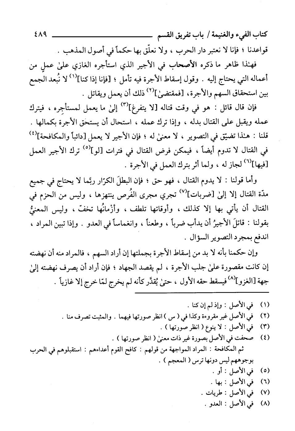 وأما قولنا: لا يدوم القتال، فهو حق؛ فإن البطلَ الكرّار ربَّما لا يحتاج في جميع مدّة القتال إلا إلى [ضربات] (7) تجري مجرى الفُرص ينتهزها، وليس من الحزم في القتال أن يأتي بها إلا كذلك، وأوقاتها تلطف، وأزْمانُها تخفّ، وليس المعنىُّ بقولنا: قاتلَ الأجيرُ أن يدأب ضرباً، وطعناً، وانغماساً في العدو. وإذا تبين المراد، اندفع بمجرد التصوير السؤال.