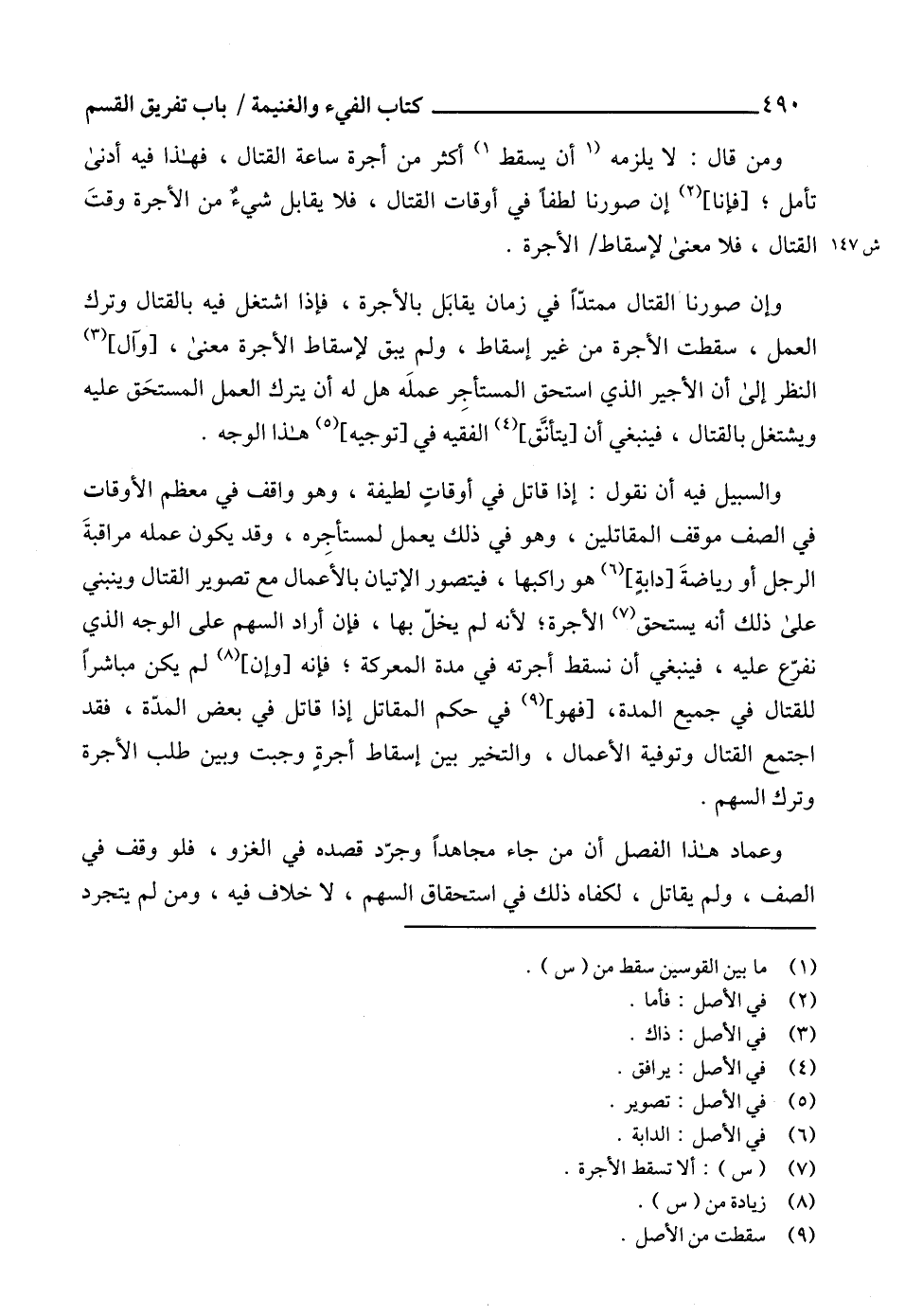والسبيل فيه أن نقول: إذا قاتل في أوقات لطيفة، وهو واقف في معظم الأوقات في الصف موقف المقاتلين، وهو في ذلك يعمل لمستأجره، وقد يكون عمله مراقبةَ الرجل أو رياضةَ [دابةٍ] (6) هو راكبها، فيتصور الإتيان بالأعَمال مع تصوير القتال وينبني على ذلك أنه يستحق (7) الأجرة؛ لأنه لم يخلّ بها، فإن أراد السهم على الوجه الذي نفرعّ عليه، فينبغي أن نسقط أجرته في مدة المعركة؛ فإنه [وإن] (8) لم يكن مباشراً للقتال في جميع المدة، [فهو] (9) في حكم المقاتل إذا قاتل في بعض المدّة، فقد اجتمع القتال وتوفية الأعمال، والتخير بين إسقاط أجرةٍ وجبت وبين طلب الأجرة وترك السهم.