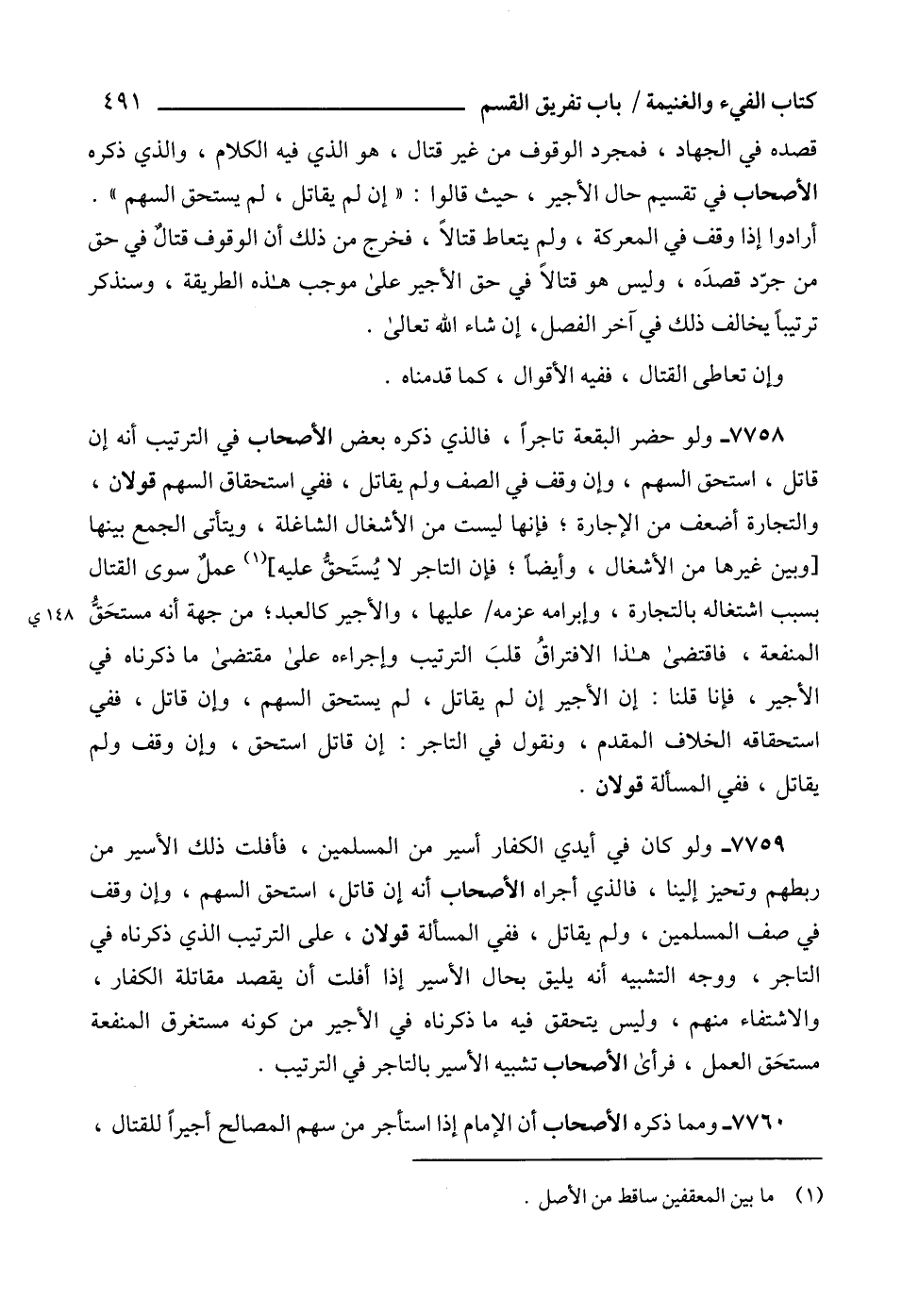 7759 - ولو كان في أيدي الكفار أسير من المسلمين، فأفلت ذلك الأسير من ربطهم وتحيز إلينا، فالذي أجراه الأصحاب أنه إن قاتل، استحق السهم، وإن وقف في صف المسلمين، ولم يقاتل، ففي المسألة قولان، على الترتيب الذي ذكرناه في التاجر، ووجه التشبيه أنه يليق بحال الأسير إذا أفلت أن يقصد مقاتلة الكفار، والاشتفاء منهم، وليس يتحقق فيه ما ذكرناه في الأجير من كونه مستغرق المنفعة مستحَق العمل، فرأى الأصحاب تشبيه الأسير بالتاجر في الترتيب.