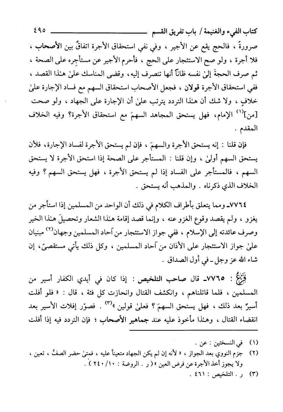 7765 - قال صاحب التلخيص: إذا كان في أيدي الكفار أسير من المسلمين، فلما قاتلناهم، وانكشف القتال وانحازت كل فئة، قال: "فلو أفلت أسيرٌ بعد ذلك، فهل يستحق السهمَ؟ فعلى قولين" (3). فصوّر إفلات الأسير بعد انقضاء القتال، وهذا مأخوذ عليه عند جماهير الأصحاب؛ فإن التردد فيه إذا أفلت