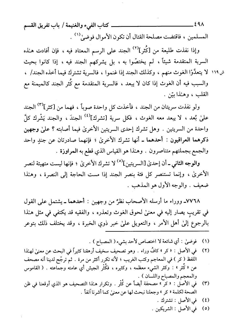 (2) في الأصل: "كر" كافُ وراء. وهو تصحيف سخيف أرهقنا كثيراً في البحث عن معنى لهذا اللفظ (كر) في المعاجم وكتب الغريب؛ لأنه تكرر أكثر من مرة. ثم ترجح لدينا أنه مصحف عن "كُثر": وكثر الشيء معظمه، وكثيره، فكُثْر الجيش أي عامته وجماعته. (القاموس والمعجم والمصباح واللسان).