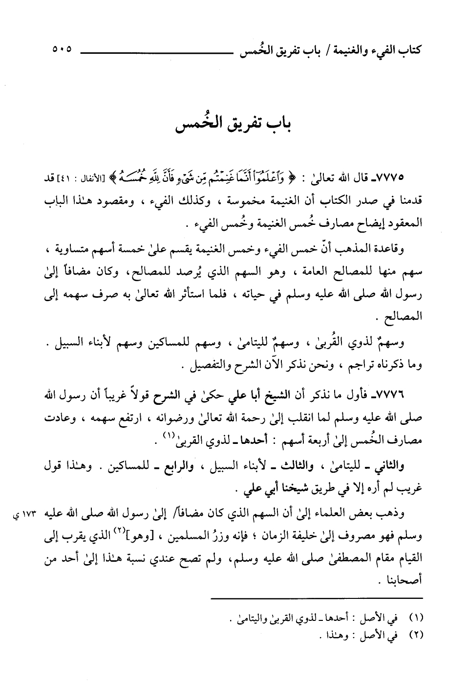 7776 - فأول ما نذكر أن الشيخ أبا علي حكى في الشرح قولاً غريباً أن رسول الله صلى الله عليه وسلم لما انقلب إلى رحمة الله تعالى ورضوانه، ارتفع سهمه، وعادت مصارف الخُمس إلى أربعة أسهم: أحدها - لذوي القربى (1).