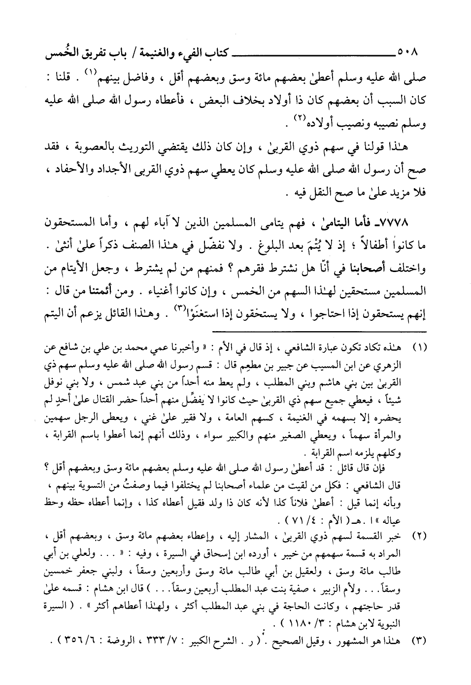 (1) هذه تكاد تكون عبارة الشافعي، إذ قال في الأم: "وأخبرنا عمي محمد بن علي بن شافع عن الزهري عن ابن المسيب عن جبير بن مطعِم قال: قسم رسول الله صلى الله عليه وسلم سهم ذي القربى بين بني هاشم وبني المطلب، ولم يعط منه أحداً من بني عبد شمس، ولا بني نوفل شيئاً، فيعطي جميع سهم ذي القربى حيث كانوا لا يفضِّل منهم أحداً حضر القتال على أحدٍ لم يحضره إلا بسهمه في الغنيمة، كسهم العامة، ولا فقير على غني، ويعطى الرجل سهمين والمرأة سهماً، ويعطي الصغير منهم والكبير سواء، وذلك أنهم إنما أعطوا باسم القرابة، وكلهم يلزمه اسم القرابة.