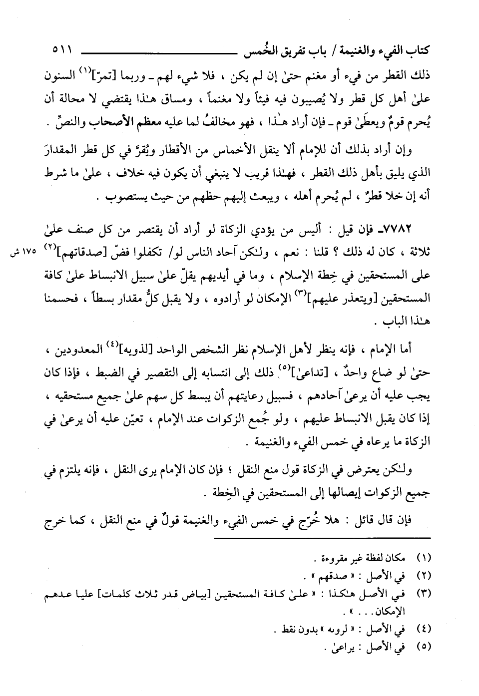 7782 - فإن قيل: أليس من يؤدي الزكاة لو أراد أن يقتصر من كل صنف على ثلاثة، كان له ذلك؟ قلنا: نعم، ولكن آحاد الناس لو تكفلوا فضّ [صدقاتهم] (2) على المستحقين في خِطة الإسلام، وما في أيديهم يقلّ على سبيل الانبساط على كافة المستحقين [ويتعذر عليهم] (3) الإمكان لو أرادوه، ولا يقبل كلُّ مقدار بسطاً، فحسمنا هذا الباب.