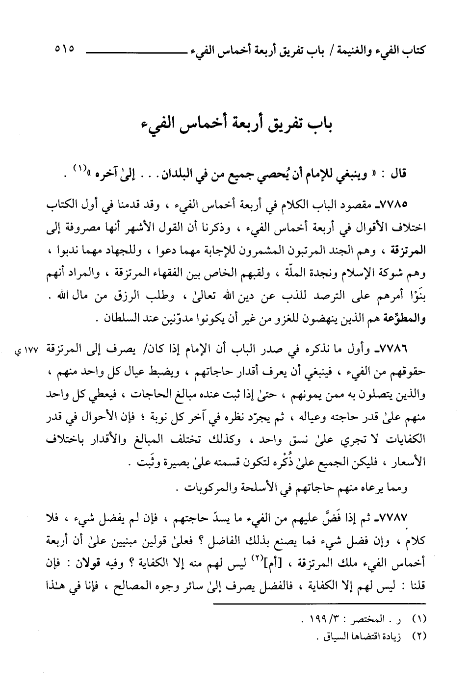 7785 - مقصود الباب الكلام في أربعة أخماس الفيء، وقد قدمنا في أول الكتاب اختلاف الأقوال في أربعة أخماس الفيء، وذكرنا أن القول الأشهر أنها مصروفة إلى المرتزقة، وهم الجند المرتبون المشمرون للإجابة مهما دعوا، وللجهاد مهما ندبوا، وهم شوكة الإسلام ونجدة الملّة، ولقبهم الخاص بين الفقهاء المرتزقة، والمراد أنهم بنَوْا أمرهم على الترصد للذب عن دين الله تعالى، وطلب الرزق من مال الله.