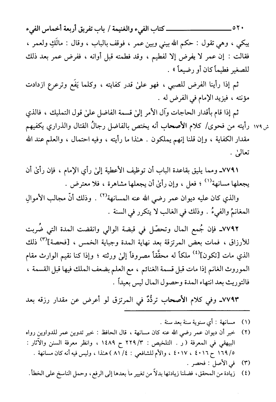 7791 - ومما يليق بقاعدة الباب أن توظيف الأعطية إلى رأي الإمام، فإن رأى أن يجعلها مسانهة (1)، فعل، وإن رأى أن يجعلها مشاهرة، فلا معترض.