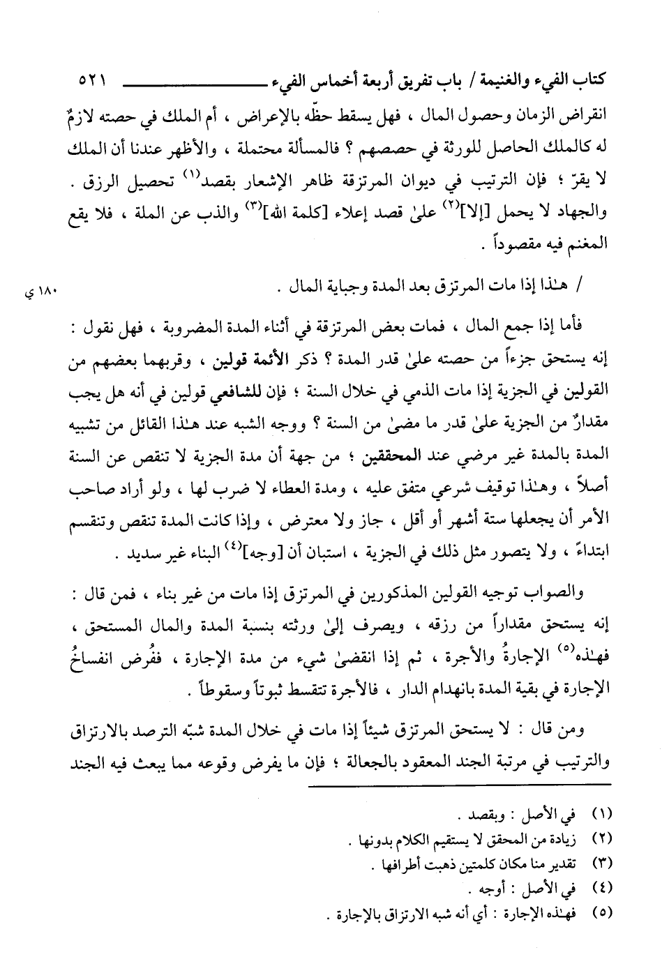 انقراض الزمان وحصول المال، فهل يسقط حطه بالإعراض، أم الملك في حصته لازمٌ له كالملك الحاصل للورثة في حصصهم؟ فالمسألة محتملة، والأظهر عندنا أن الملك لا يقرّ؛ فإن الترتيب في ديوان المرتزقة ظاهر الإشعار بقصد (1) تحصيل الرزق.