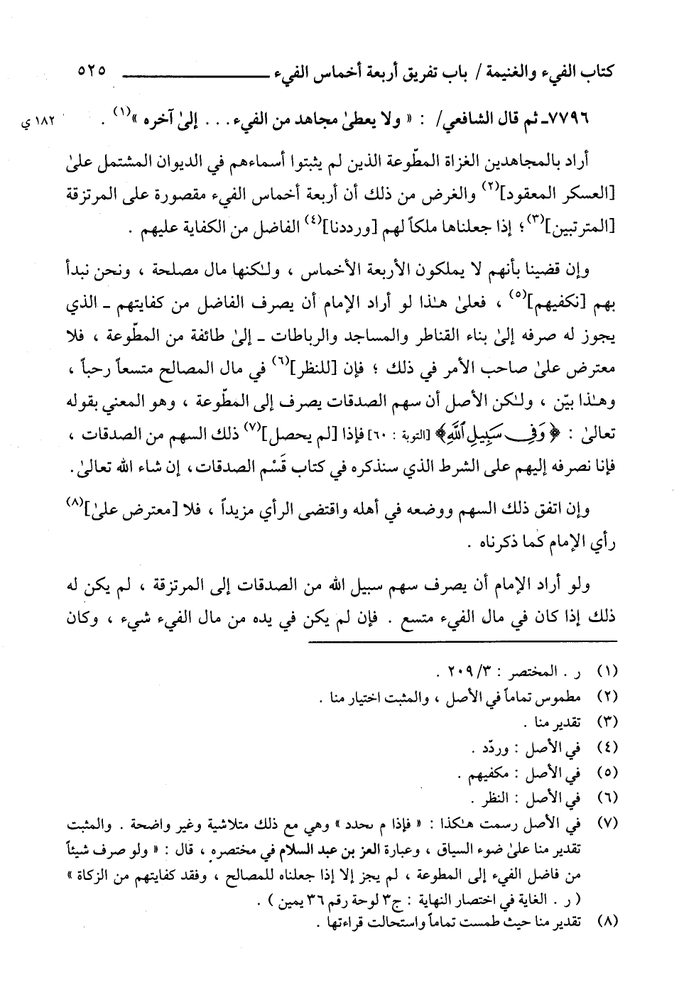 (7) في الأصل رسمت هكذا: "فإذا م ـحدد" وهي مع ذلك متلاشية وغير واضحة. والمثبت تقدير منا على ضوء السياق، وعبارة العز بن عبد السلام في مختصره، قال: "ولو صرف شيئاً من فاضل الفيء إلى المطوعة، لم يجز إلا إذا جعلناه للمصالح، وفقد كفايتهم من الزكاة" (ر. الغاية في اختصار النهاية: ج 3 لوحة رقم 36 يمين).