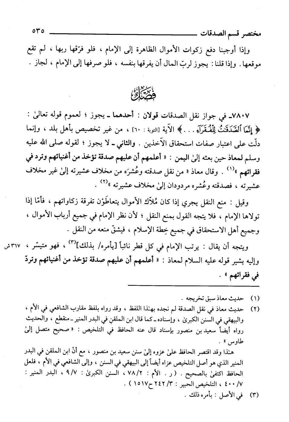 7807 - في جواز نقل الصدقات قولان: أحدهما - يجوز؛ لعموم قوله تعالى: {إِنَّمَا الصَّدَقَاتُ لِلْفُقَرَاءِ ... } الآية [التوبة: 60]، من غير تخصيص بأهل بلد، وإنما دلّت على اعتبار صفات استحقاق الآخذين. والثاني - لا يجوز؛ لقوله صلى الله عليه وسلم لمعاذ حين بعثه إلى اليمن: "أعلمهم أن عليهم صدقة تؤخذ من أغنيائهم وترد في فقرائهم" (1). وقال معاذ "من نقل صدقته وعُشرَه من مخلاف عشيرته إلى غير مخلاف عشيرته، فصدقته وعُشره مردودان إلى مخلاف عشيرته" (2).