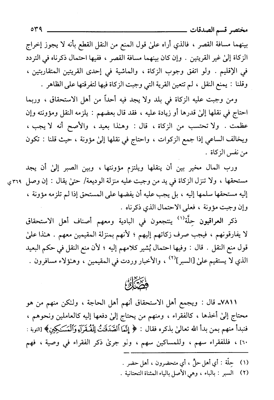 7811 - قال: ويجمع أهل الاستحقاق أنهم أهل الحاجة، ولكن منهم من هو محتاج إلى أخذها، كالفقراء، ومنهم من يحتاج إلى دفعها إليه كالعاملين ونحوهم، فنبدأ منهم بمن بدأ الله تعالى بذكره فقال: {إِنَّمَا الصَّدَقَاتُ لِلْفُقَرَاءِ وَالْمَسَاكِينِ} [التوبة: 60]، فللفقراء سهم، وللمساكين سهم، ولو جرى ذكر الفقراء في وصية، فهم