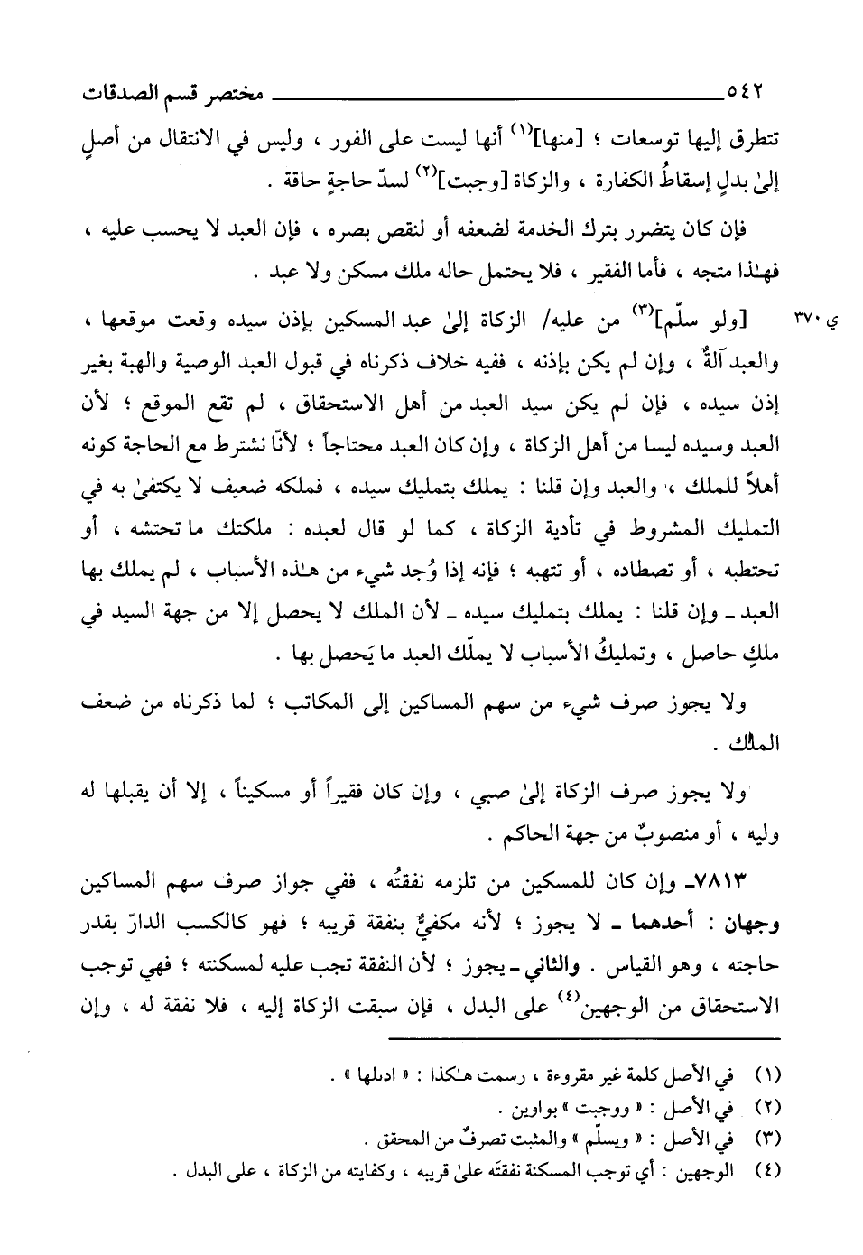 (4) الوجهين: أي توجب المسكنة نفقتَه على قريبه، وكفايته من الزكاة، على البدل.