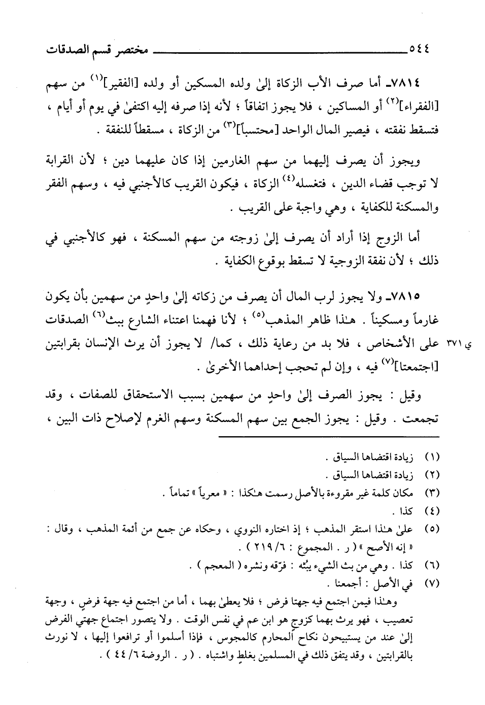 7814 - أما صرف الأب الزكاة إلى ولده المسكين أو ولده [الفقير] (1) من سهم [الفقراء] (2) أو المساكين، فلا يجوز اتفاقاً؛ لأنه إذا صرفه إليه اكتفى في يوم أو أيام، فتسقط نفقته، فيصير المال الواحد [محتسباً] (3) من الزكاة، مسقطاً للنفقة.