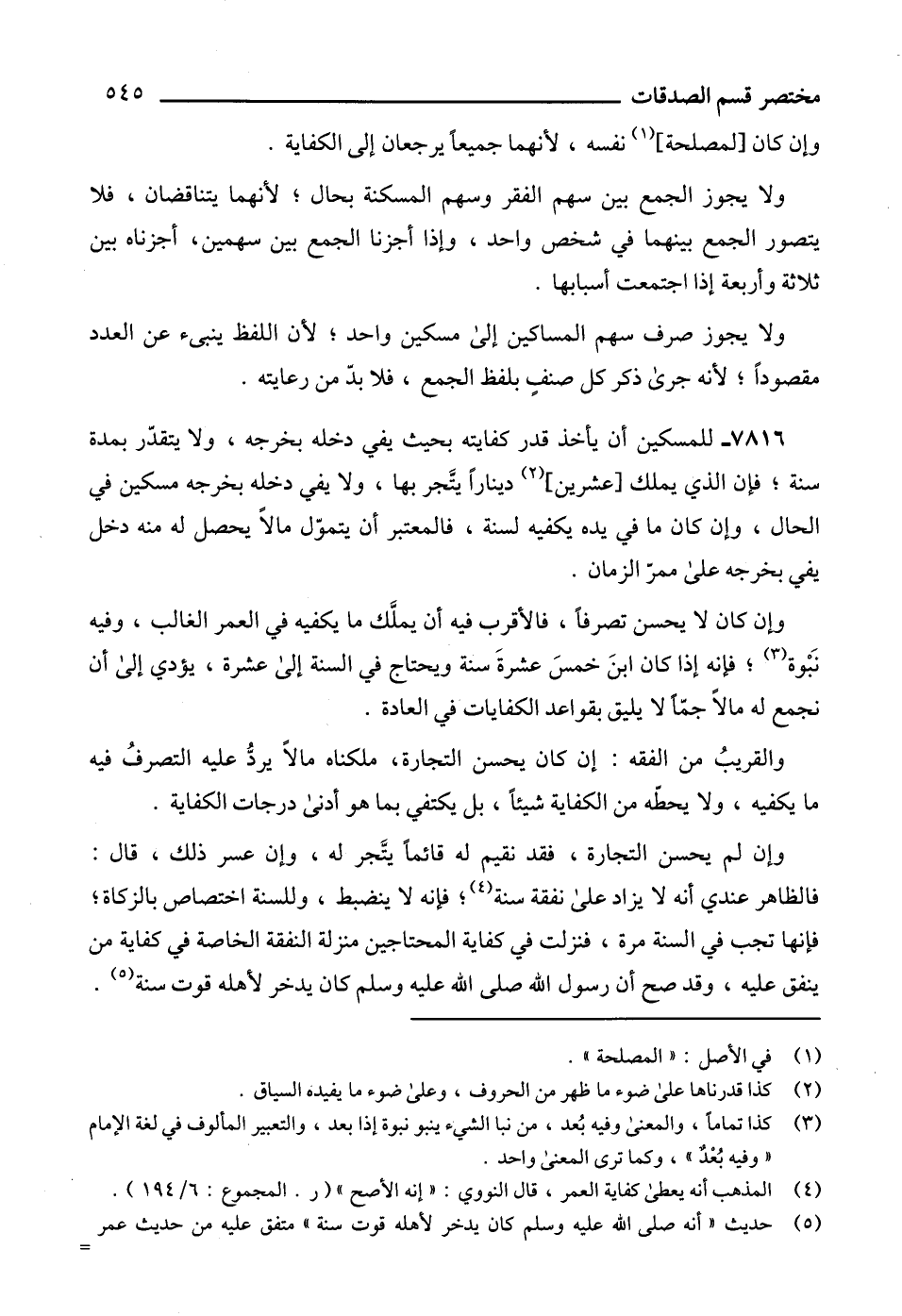 7816 - للمسكين أن يأخذ قدر كفايته بحيث يفي دخله بخرجه، ولا يتقدّر بمدة سنة؛ فإن الذي يملك [عشرين] (2) ديناراً يتَّجر بها، ولا يفي دخله بخرجه مسكين في الحال، وإن كان ما في يده يكفيه لسنة، فالمعتبر أن يتموّل مالاً يحصل له منه دخل يفي بخرجه على ممرّ الزمان.
