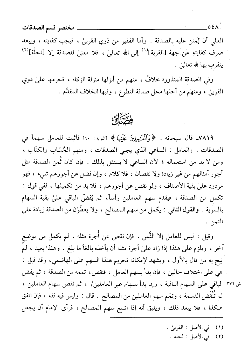 7819 - قال سبحانه: {وَالْعَامِلِينَ عَلَيْهَا} [التوبة: 60] فأثبت للعامل سهماً في الصدقات. والعامل: الساعي الذي يجبي الصدقات، ومنهم الحُسّاب والكتّاب، ومن لا بد من استعماله؛ لأن الساعي لا يستقل بذلك. فإن كان ثُمن الصدقة مثل أجور أمثالهم من غير زيادة ولا نقصان، فلا كلام، وإن فضل عن أجورهم شيء، فهو مردود على بقية الأصناف، ولو نقص عن أجورهم، فلا بد من تكميلها، ففي قول: تكمل من الصدقة، فيقدم سهم العاملين رأساً، ثم يُفضّ الباقي على بقية السهام بالسوية. والقول الثاني: يكمل من سهم المصالح، ولا يعطَوْن من الصدقة زيادة على الثمن.