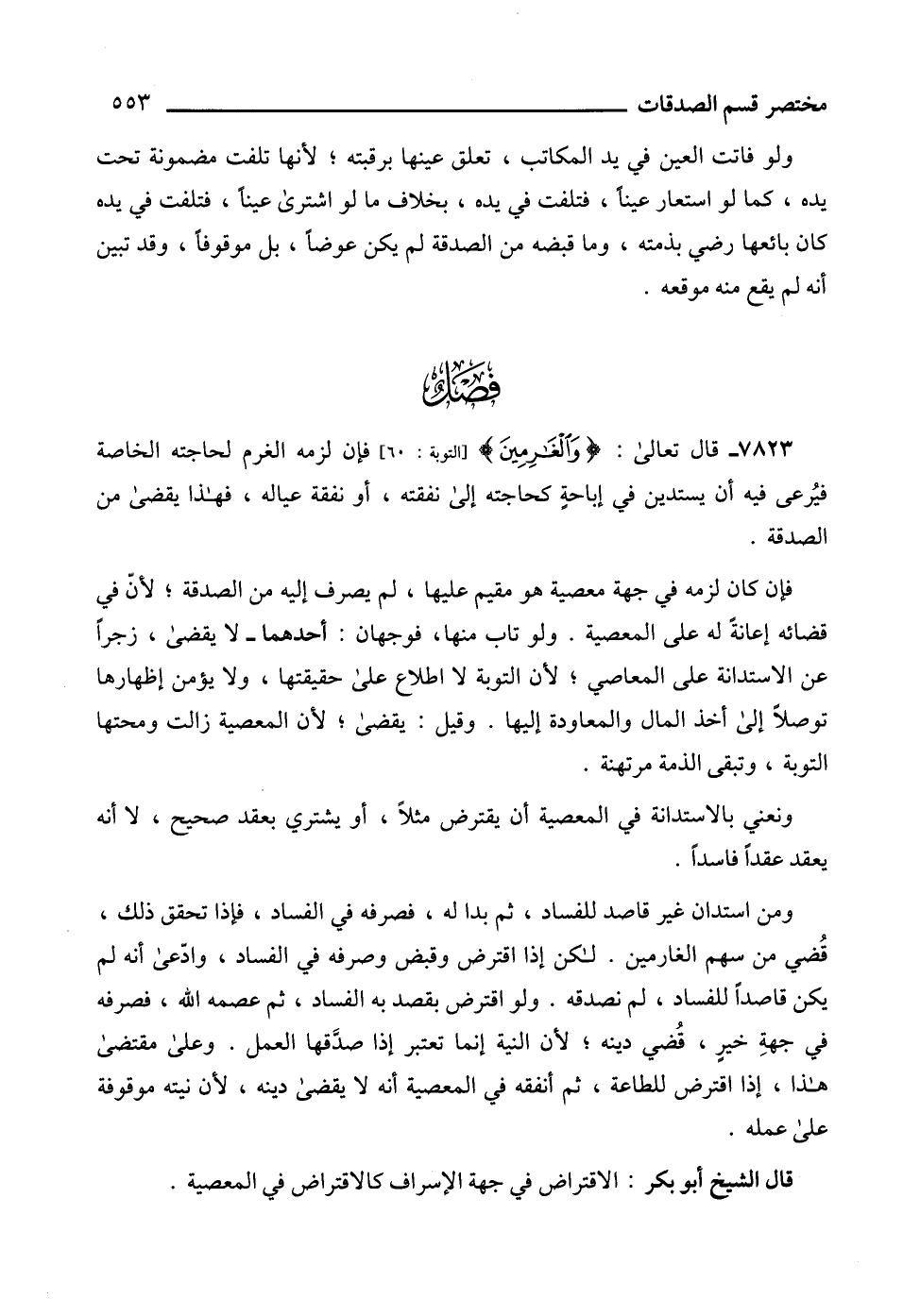 7823 - قال تعالى: {وَالْغَارِمِينَ} [التوبة: 60] فإن لزمه الغرم لحاجته الخاصة فيُرعى فيه أن يستدين في إباحةٍ كحاجته إلى نفقته، أو نفقة عياله، فهذا يقضى من الصدقة.