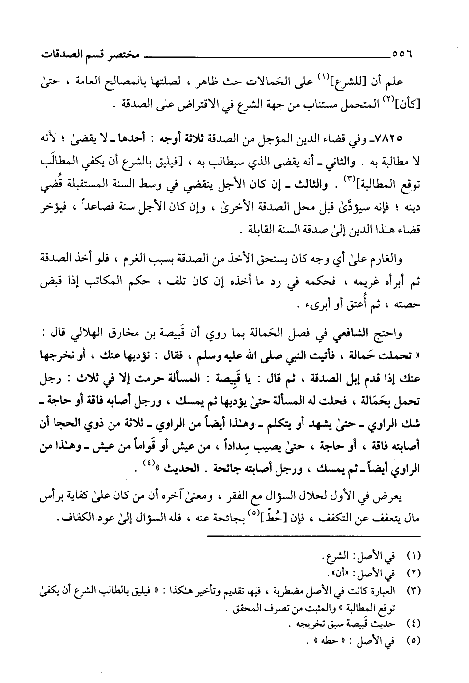 واحتج الشافعي في فصل الحَمالة بما روي أن قَبيصة بن مخارق الهلالي قال: "تحملت حَمالة، فأتيت النبي صلى الله عليه وسلم، فقال: نؤديها عنك، أو نخرجها عنك إذا قدم إبل الصدقة، ثم قال: يا قَبِيصة: المسألة حرمت إلا في ثلاث: رجل تحمل بحَمَالة، فحلت له المسألة حتى يؤديها ثم يمسك، ورجل أصابه فاقة أو حاجة -شك الراوي- حتى يشهد أو يتكلم -وهذا أيضاً من الراوي- ثلاثة من ذوي الحجا أن أصابته فاقة، أو حاجة، حتى يصيب سِداداً، من عيش أو قَواماً من عيش -وهذا من الراوي أيضاً- ثم يمسك، ورجل أصابته جائحة. الحديث" (4).