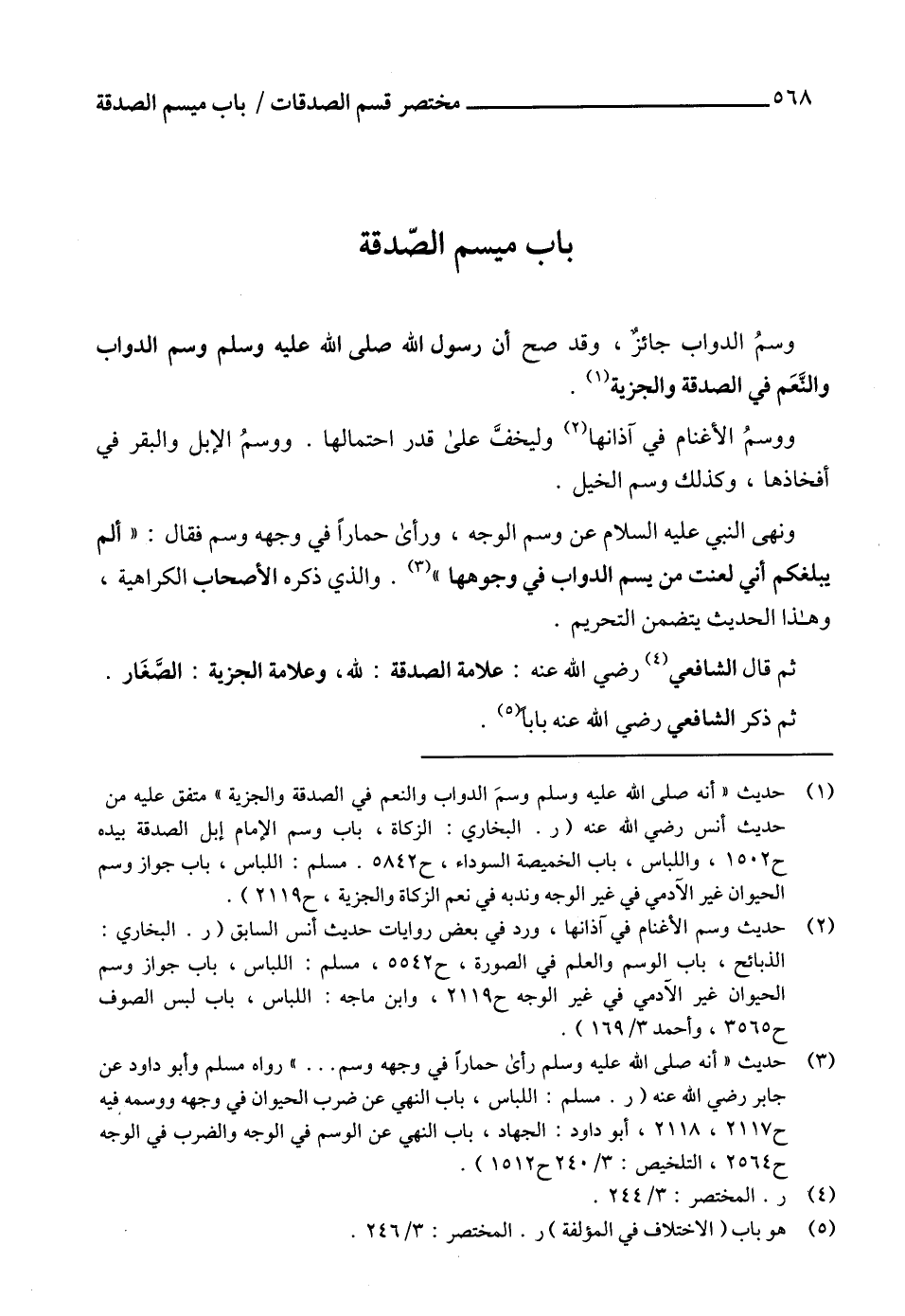 (1) حديث "أنه صلى الله عليه وسلم وسمَ الدواب والنعم في الصدقة والجزية" متفق عليه من حديث أنس رضي الله عنه (ر. البخاري: الزكاة، باب وسم الإمام إبل الصدقة بيده ح 1502، واللباس، باب الخميصة السوداء، ح 5842. مسلم: اللباس، باب جواز وسم الحيوان غير الآدمي في غير الوجه وندبه في نعم الزكاة والجزية، ح 2119).