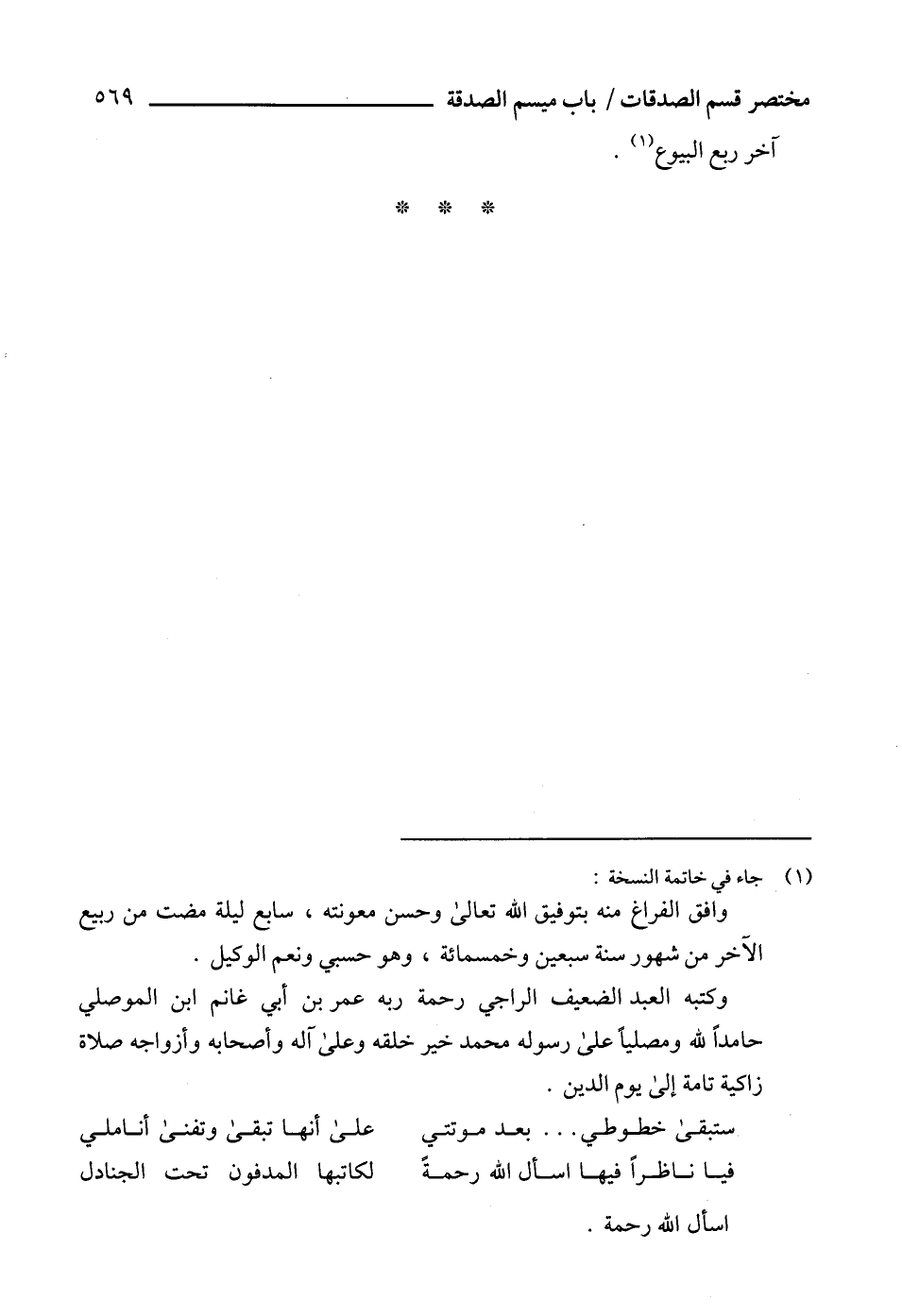 وكتبه العبد الضعيف الراجي رحمة ربه عمر بن أبي غانم ابن الموصلي حامداً لله ومصلياً على رسوله محمد خير خلقه وعلى آله وأصحابه وأزواجه صلاة زاكية تامة إلى يوم الدين.