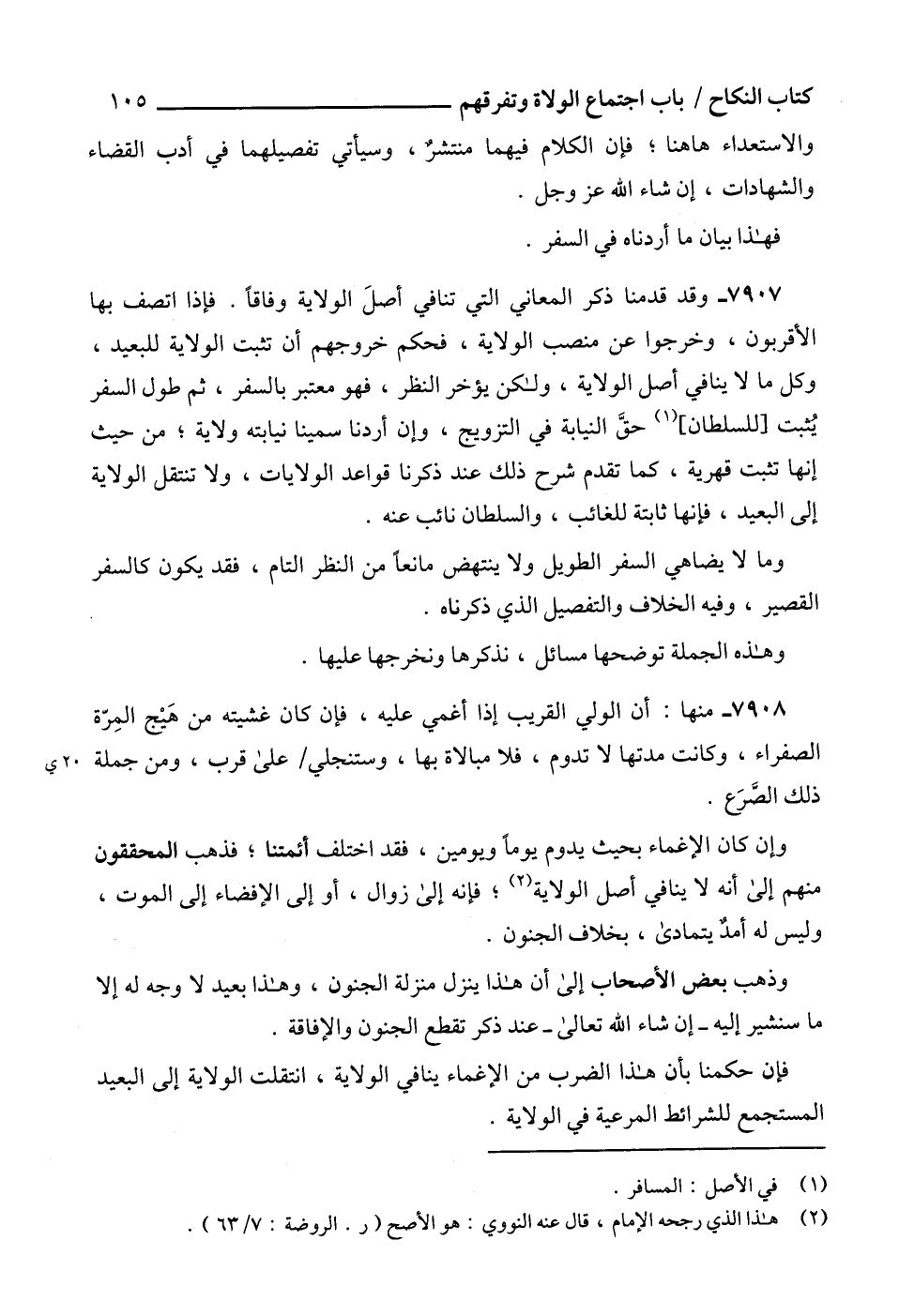 7907 - وقد قدمنا ذكر المعاني التي تنافي أصلَ الولاية وفاقاً. فإذا اتصف بها الأقربون، وخرجوا عن منصب الولاية، فحكم خروجهم أن تثبت الولاية للبعيد، وكل ما لا ينافي أصل الولاية، ولكن يؤخر النظر، فهو معتبر بالسفر، ثم طول السفر يُثبت [للسلطان] (1) حقَّ النيابة في التزويج، وإن أردنا سمينا نيابته ولاية؛ من حيث إنها تثبت قهرية، كما تقدم شرح ذلك عند ذكرنا قواعد الولايات، ولا تنتقل الولاية إلى البعيد، فإنها ثابتة للغائب، والسلطان نائب عنه.
