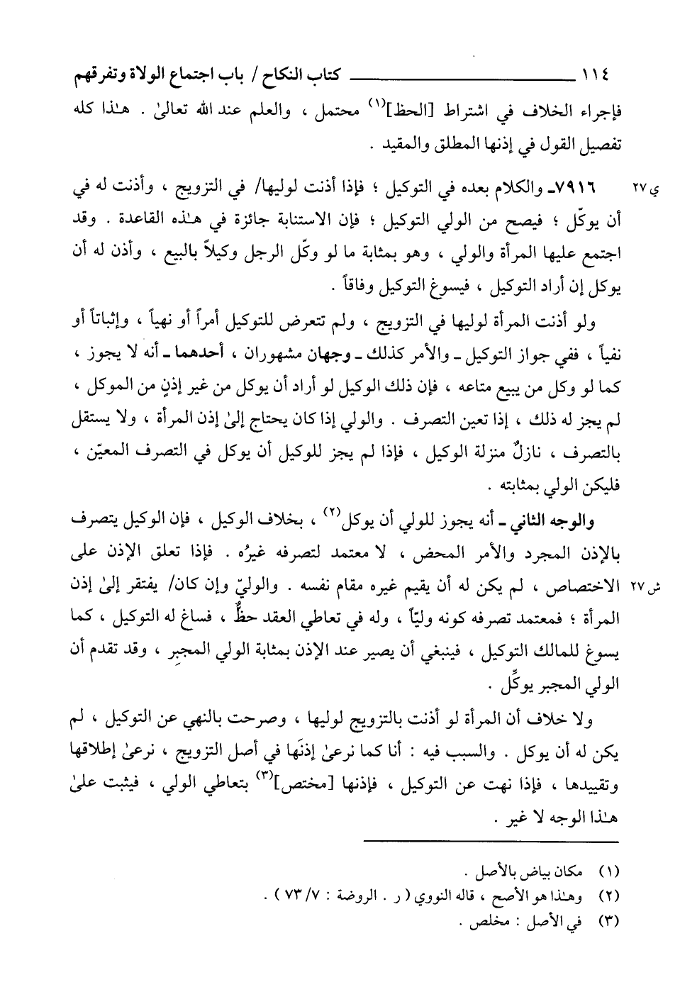 7916 - والكلام بعده في التوكيل، فإذا أذنت لوليها في التزويج، وأذنت له في أن يوكّل، فيصح من الولي التوكيل، فإن الاستنابة جائزة في هذه القاعدة. وقد اجتمع عليها المرأة والولي، وهو بمثابة ما لو وكّل الرجل وكيلاً بالبيع، وأذن له أن يوكل إن أراد التوكيل، فيسوغ التوكيل وفاقاً.