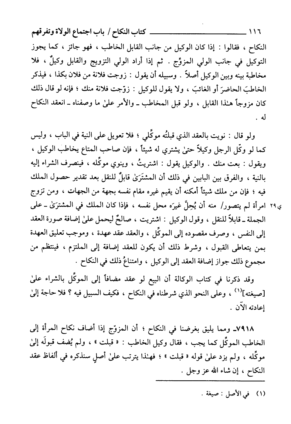 7918 - ومما يليق بغرضنا في النكاح؛ أن المزوّج إذا أضاف نكاح المرأة إلى الخاطب الموكِّل كما يجب، فقال وكيل الخاطب: "قبلت"، ولم يُضف قبولَه إلى موكِّله، ولم يزد على قوله "قبلت"؛ فهذا يترتب على أصلٍ سنذكره في ألفاظ عقد النكاح، إن شاء الله عز وجل.