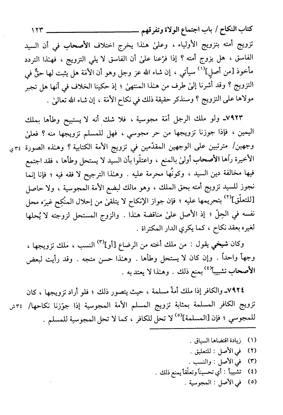 7923 - ولو ملك الرجل أمَة مجوسية، فلا شك أنه لا يستبيح وطأها بملك اليمين، فإذا جوزنا تزويجها من حر مجوسي، فهل للمسلم تزويجها منه؟ فعلى وجهين مترتبين على الوجهين المقدّمين في تزويج الأمة الكتابية؟ وهذه الصورة الأخيرة رآها الأصحاب أولى بالمنع، واعتلّوا بأن السيد لا يستحل وطأها، فقد اجتمع فيها مخالفة دين السيد، وكونُها محرمة عليه. وهذا الترجيح لا فقه فيه؛ فإنا إنما نجوز للسيد تزويج أمته بحق الملك، وهو مالك لبضع الأمة المجوسية، ولا حاصل [للتعلّق] (2) بتحريمها عليه؛ فإن جواز الإنكاح لا يتلقى من إحلال المنْكِح غيرَه محل نفسه في الحِلّ؛ إذ الأصل على مناقضة هذا. والزوج المستحل لزوجته لا يُحلها لغيره بعقد نكاح، كما يكري الدار المكتراة.
