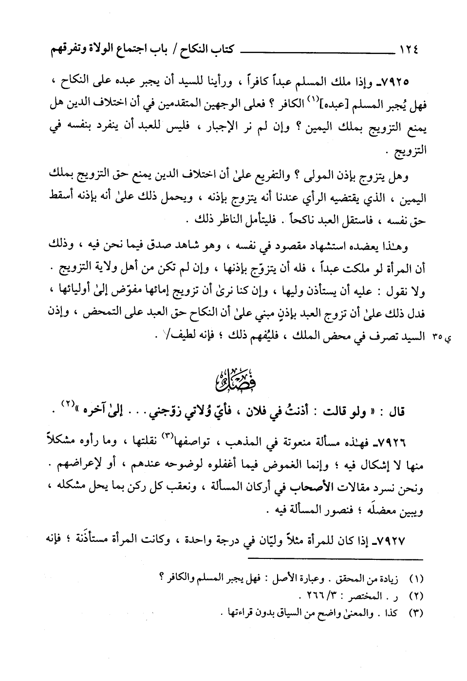 7925 - وإذا ملك المسلم عبداً كافراً، ورأينا للسيد أن يجبر عبده على النكاح، فهل يُجبر المسلم [عبده] (1) الكافر؟ فعلى الوجهين المتقدمين في أن اختلاف الدين هل يمنع التزويج بملك اليمين؟ وإن لم نر الإجبار، فليس للعبد أن ينفرد بنفسه في التزويج.