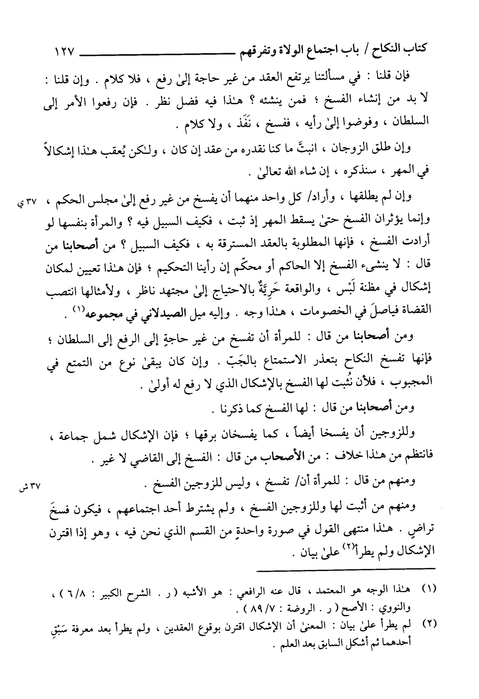 ومنهم من أثبت لها وللزوجين الفسخ، ولم يشترط أحد اجتماعهم، فيكون فسخَ تراضٍ. هذا منتهى القول في صورة واحدةٍ من القسم الذي نحن فيه، وهو إذا اقترن الإشكال ولم يطرأ (2) على بيان.