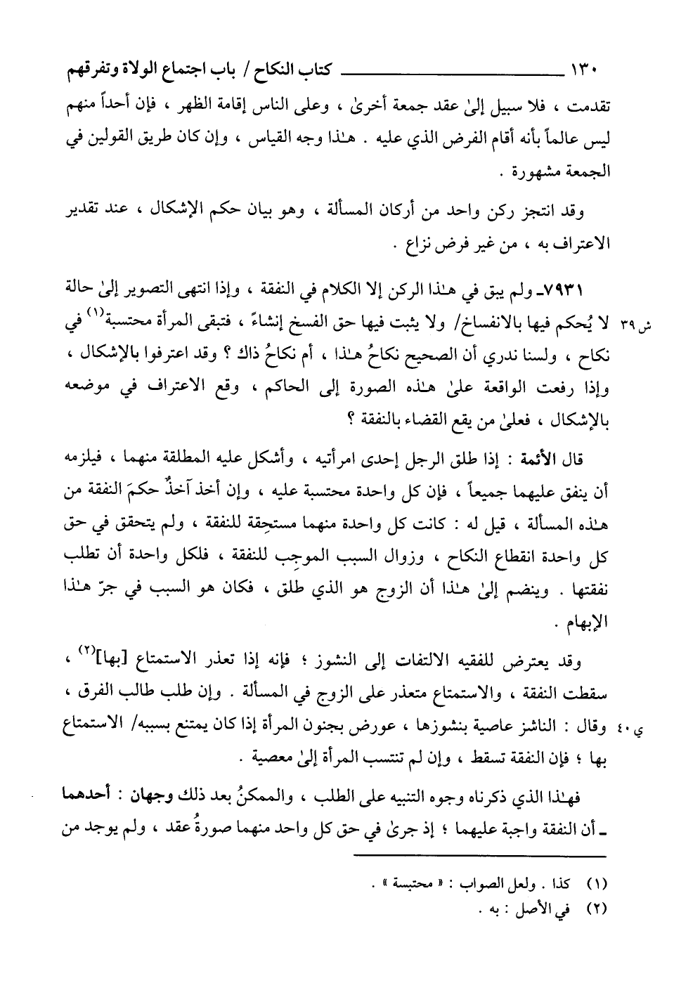 7931 - ولم يبق في هذا الركن إلا الكلام في النفقة، وإذا انتهى التصوير إلى حالة لا يُحكم فيها بالانفساخ ولا يثبت فيها حق الفسخ إنشاءً، فتبقى المرأة محتسبة (1) في نكاح، ولسنا ندري أن الصحيح نكاحُ هذا، أم نكاحُ ذاك؟ وقد اعترفوا بالإشكال، وإذا رفعت الواقعة على هذه الصورة إلى الحاكم، وقع الاعتراف في موضعه بالإشكال، فعلى من يقع القضاء بالنفقة؟