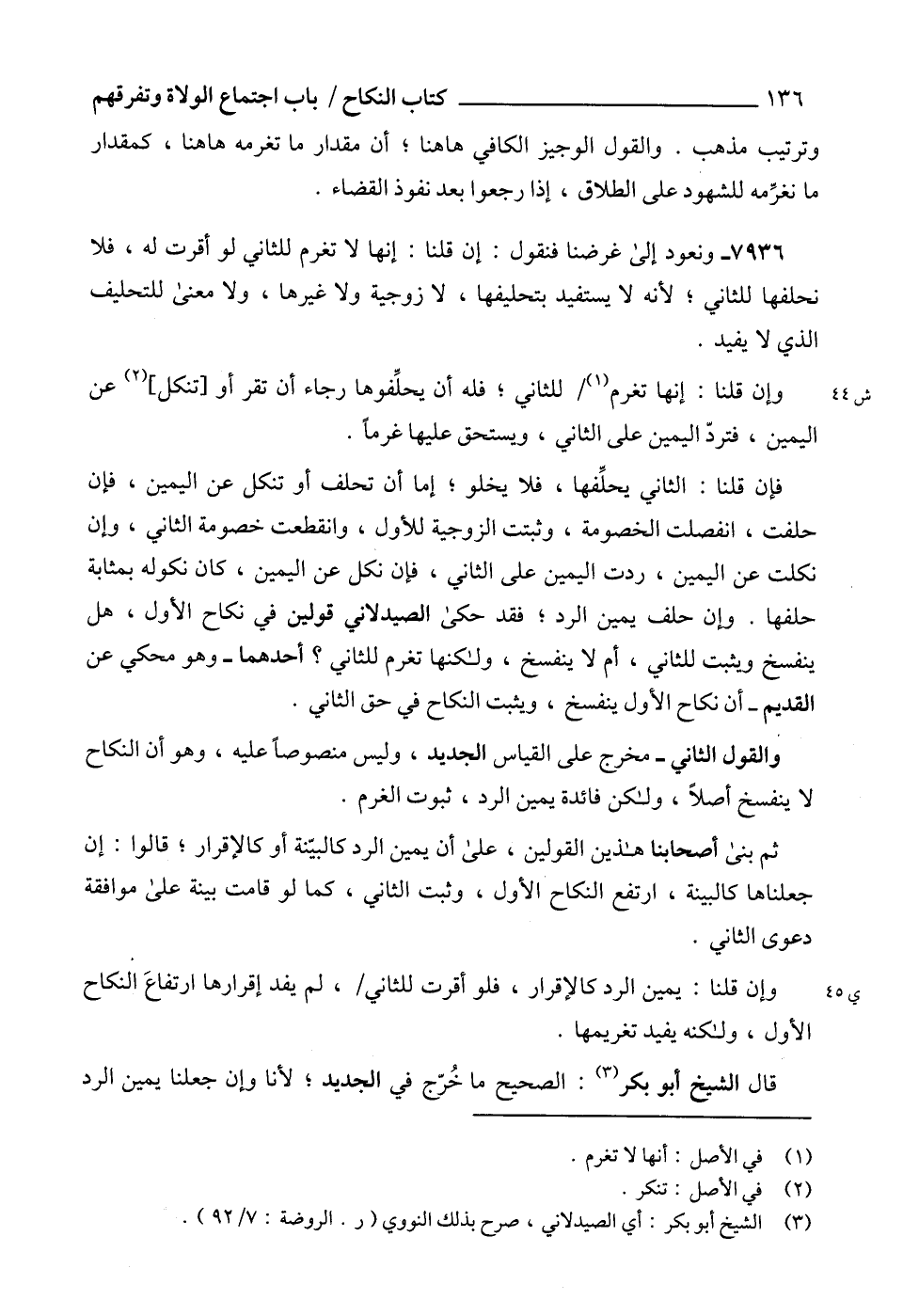 7936 - ونعود إلى غرضنا فنقول: إن قلنا: إنها لا تغرم للثاني لو أقرت له، فلا نحلفها للثاني، لأنه لا يستفيد بتحليفها، لا زوجية ولا غيرها، ولا معنى للتحليف الذي لا يفيد.