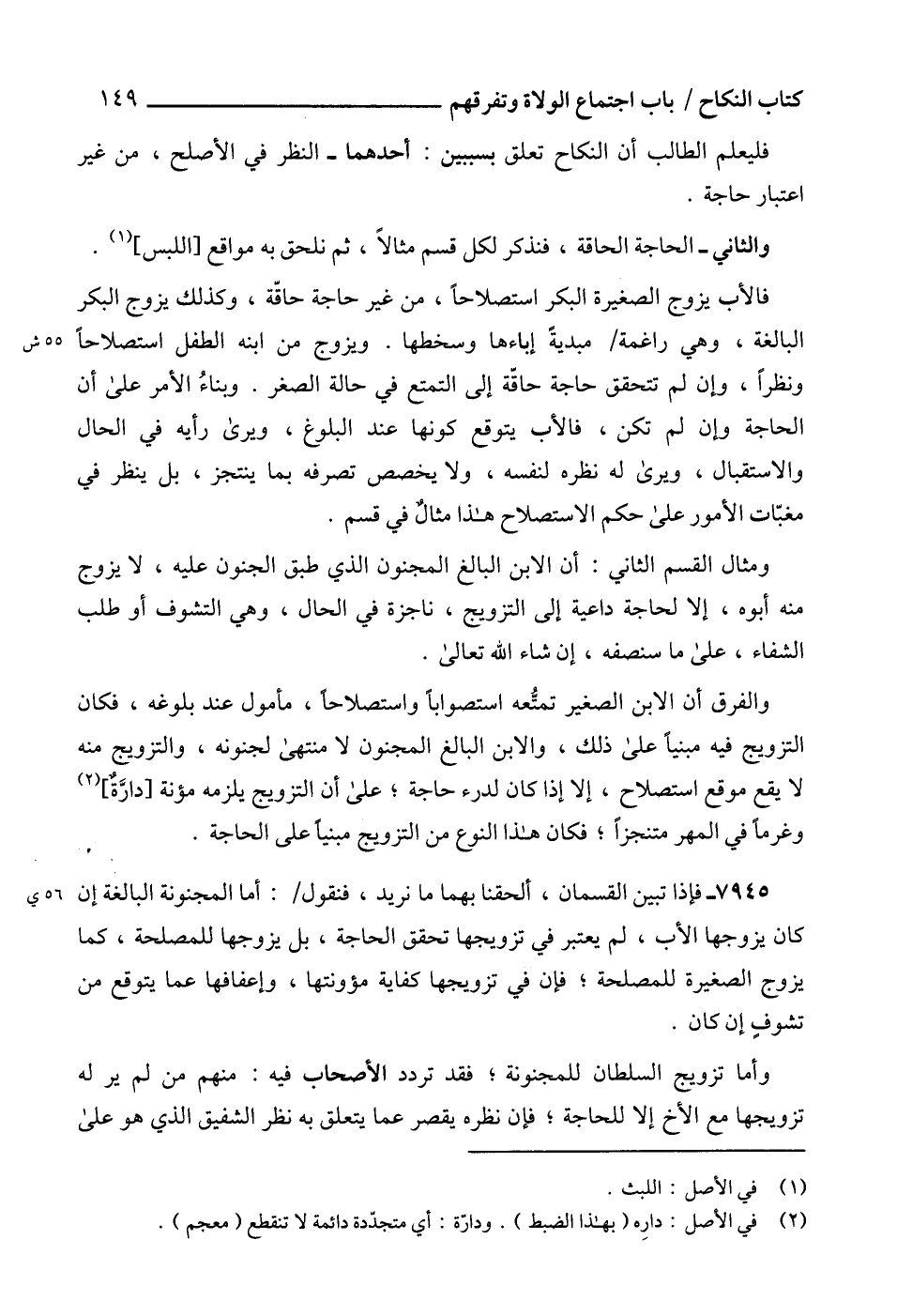 7945 - فإذا تبين القسمان، ألحقنا بهما ما نريد، فنقول: أما المجنونة البالغة إن كان يزوجها الأب، لم يعتبر في تزويجها تحقق الحاجة، بل يزوجها للمصلحة، كما يزوج الصغيرة للمصلحة؛ فإن في تزويجها كفاية مؤونتها، وإعفافها عما يتوقع من تشوفٍ إن كان.
