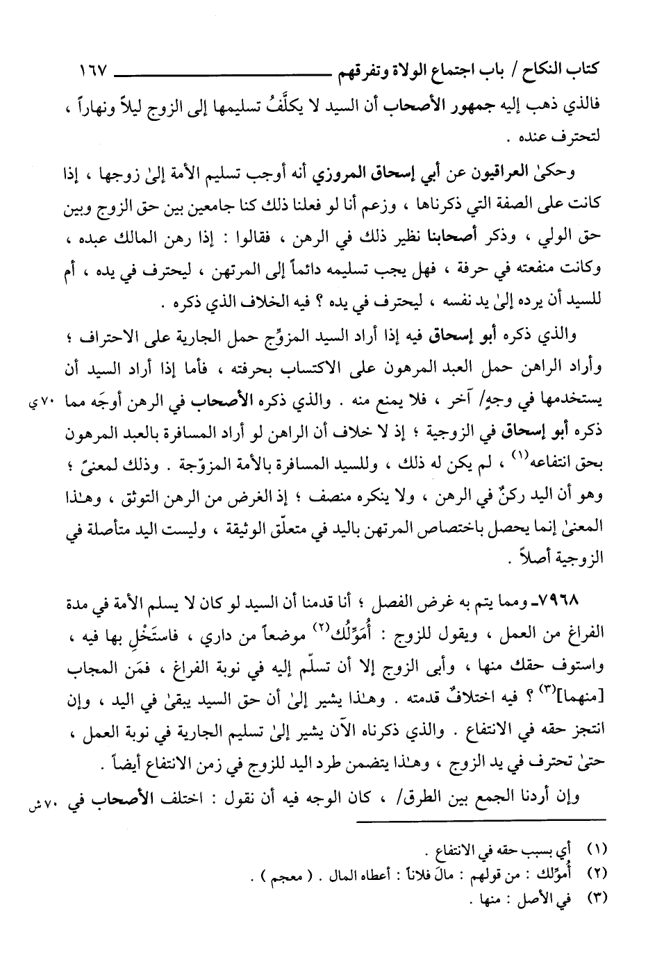 7968 - ومما يتم به غرض الفصل؛ أنا قدمنا أن السيد لو كان لا يسلم الأمة في مدة الفراغ من العمل، ويقول للزوج: أُمَوِّلُك (2) موضعاً من داري، فاستَخْلِ بها فيه، واستوف حقك منها، وأبى الزوج إلا أن تسلّم إليه في نوبة الفراغ، فمَن المجاب [منهما] (3)؛ فيه اختلافٌ قدمته. وهذا يشير إلى أن حق السيد يبقى في اليد، وإن انتجز حقه في الانتفاع. والذي ذكرناه الآن يشير إلى تسليم الجارية في نوبة العمل، حتى تحترف في يد الزوج، وهذا يتضمن طرد اليد للزوج في زمن الانتفاع أيضاًً.
