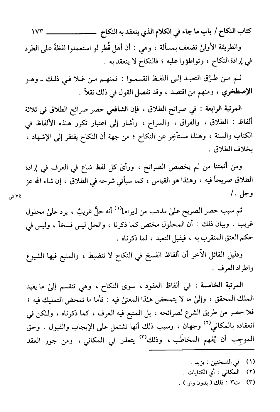 المرتبة الرابعة: في صرائح الطلاق، فإن الشافعي حصر صرائح الطلاق في ثلاثة ألفاظ: الطلاق، والفراق، والسراح، وأشار إلى اعتبار تكرر هذه الألفاظ في الكتاب والسنة، وهذا مستأخِر عن النكاح؛ من جهة أن النكاح يفتقر إلى الإشهاد، بخلاف الطلاق.