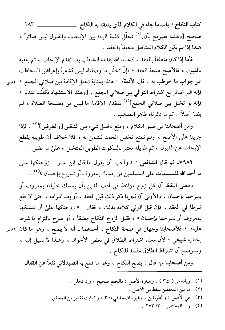 7982 - ثم قال الشافعي: "وأحب أن يقول ما قال ابن عمر: زوّجتكها على ما أخذ الله للمسلمات على المسلمين من إمساك بمعروف أو تسريح بإحسان" (4).