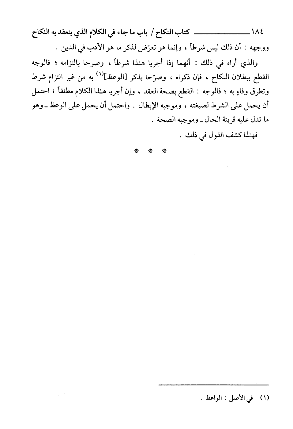 والذي أراه في ذلك: أنهما إذا أجريا هذا شرطاً، وصرحا بالتزامه؛ فالوجه القطع ببطلان النكاح، فإن ذكراه، وصرّحا بذكر [الوعظ] (1) به من غير التزام شرط وتطرق وفاءٍ به؛ فالوجه: القطع بصحة العقد، وإن أجريا هذا الكلام مطلقاً؛ احتمل أن يحمل على الشرط لصيغته، وموجبه الإبطال. واحتمل أن يحمل على الوعظ -وهو ما تدل عليه قرينة الحال- وموجبه الصحة.