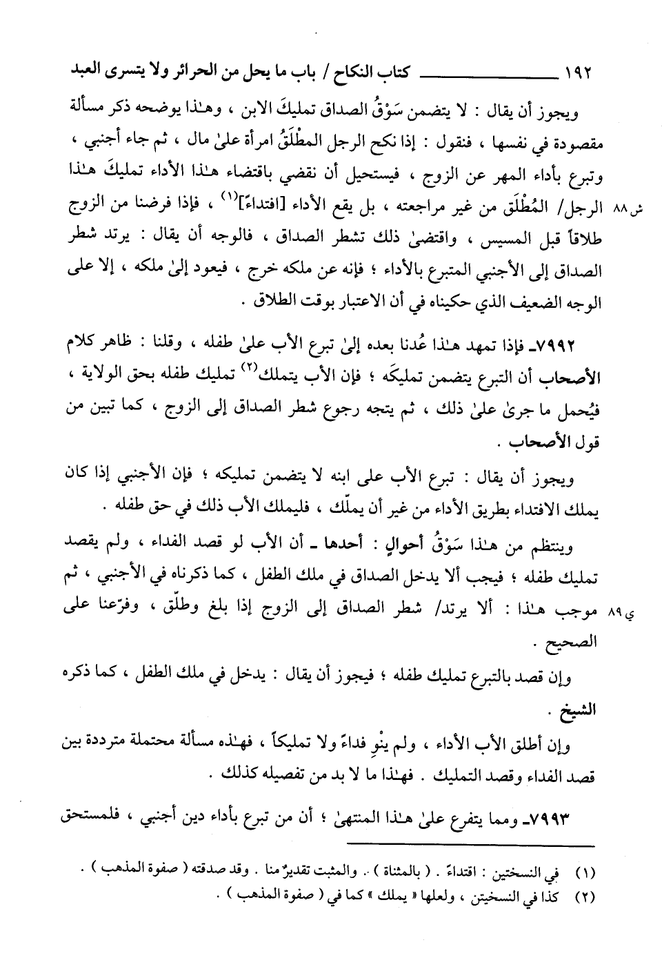 7992 - فإذا تمهد هذا عُدنا بعده إلى تبرع الأب على طفله، وقلنا: ظاهر كلام الأصحاب أن التبرع يتضمن تمليكَه؛ فإن الأب يتملك (2) تمليك طفله بحق الولاية، فيُحمل ما جرى على ذلك، ثم يتجه رجوع شطر الصداق إلى الزوج، كما تبين من قول الأصحاب.