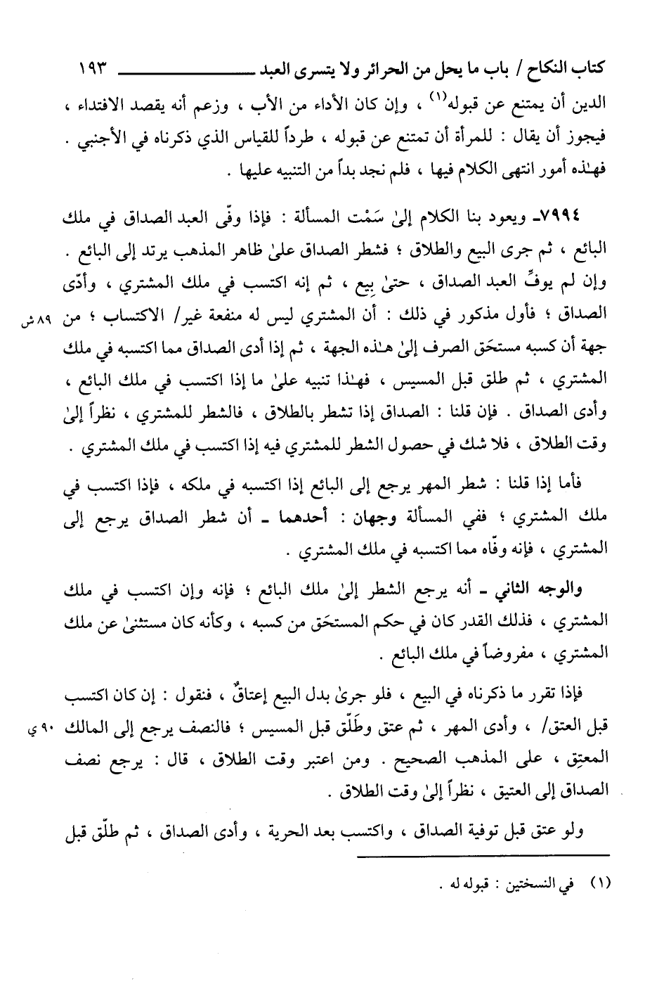 7994 - ويعود بنا الكلام إلى سَمْت المسألة: فإذا وفّى العبد الصداق في ملك البائع، ثم جرى البيع والطلاق؛ فشطر الصداق على ظاهر المذهب يرتد إلى البائع.