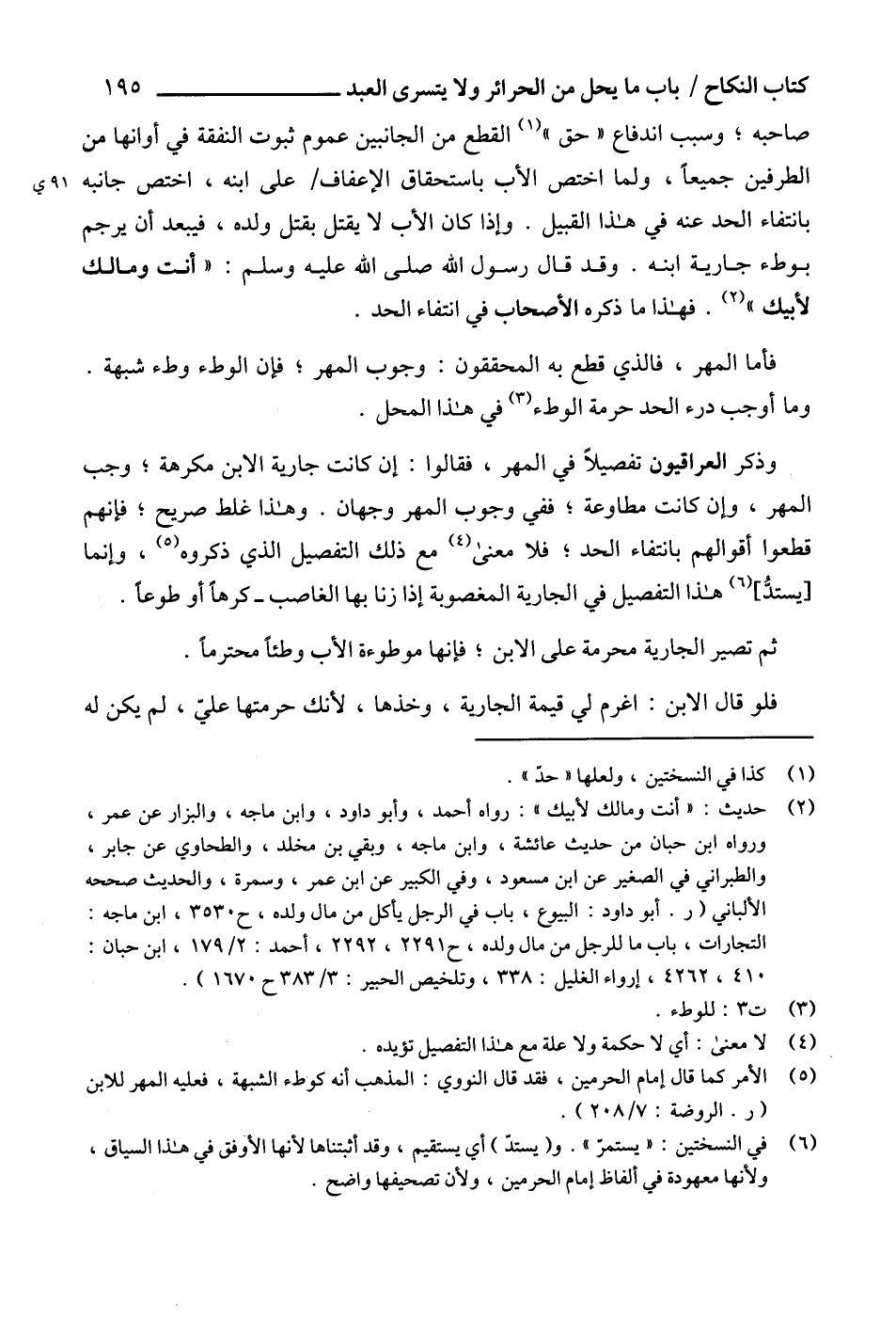 صاحبه؛ وسبب اندفاع "حق" (1) القطع من الجانبين عموم ثبوت النفقة في أوانها من الطرفين جميعاً، ولما اختص الأب باستحقاق الإعفاف على ابنه، اختص جانبه بانتفاء الحد عنه في هذا القبيل. وإذا كان الأب لا يقتل بقتل ولده، فيبعد أن يرجم بوطء جارية ابنه. وقد قال رسول الله صلى الله عليه وسلم: "أنت ومالك لأبيك" (2). فهذا ما ذكره الأصحاب في انتفاء الحد.