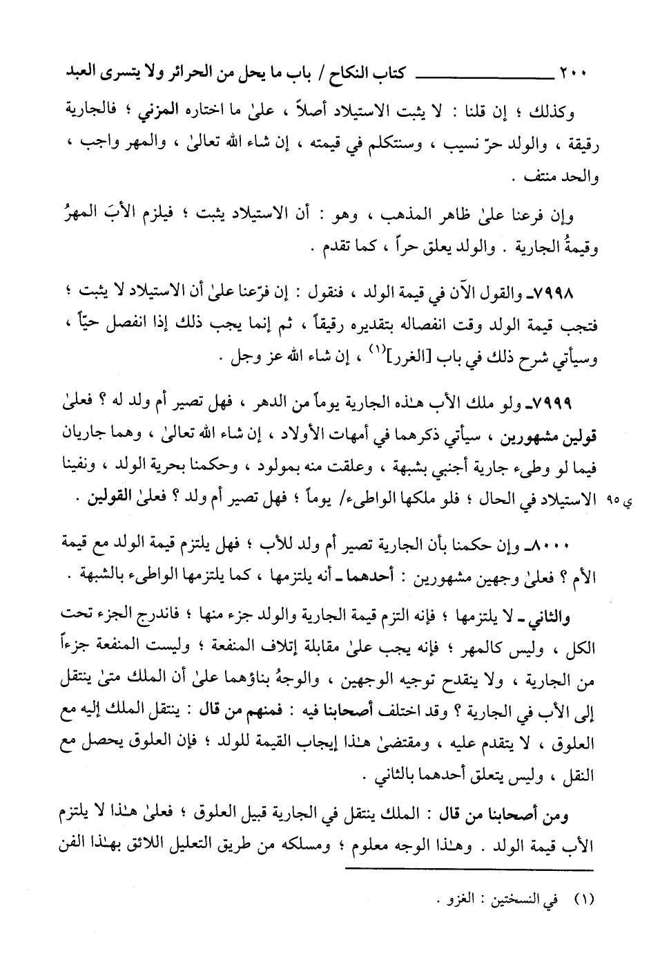 7999 - ولو ملك الأب هذه الجارية يوماً من الدهر، فهل تصير أم ولد له؟ فعلى قولين مشهورين، سيأتي ذكرهما في أمهات الأولاد، إن شاء الله تعالى، وهما جاريان فيما لو وطىء جارية أجنبي بشبهة، وعلقت منه بمولود، وحكمنا بحرية الولد، ونفينا الاستيلاد في الحال؛ فلو ملكها الواطىء يوماً؛ فهل تصير أم ولد؟ فعلى القولين.