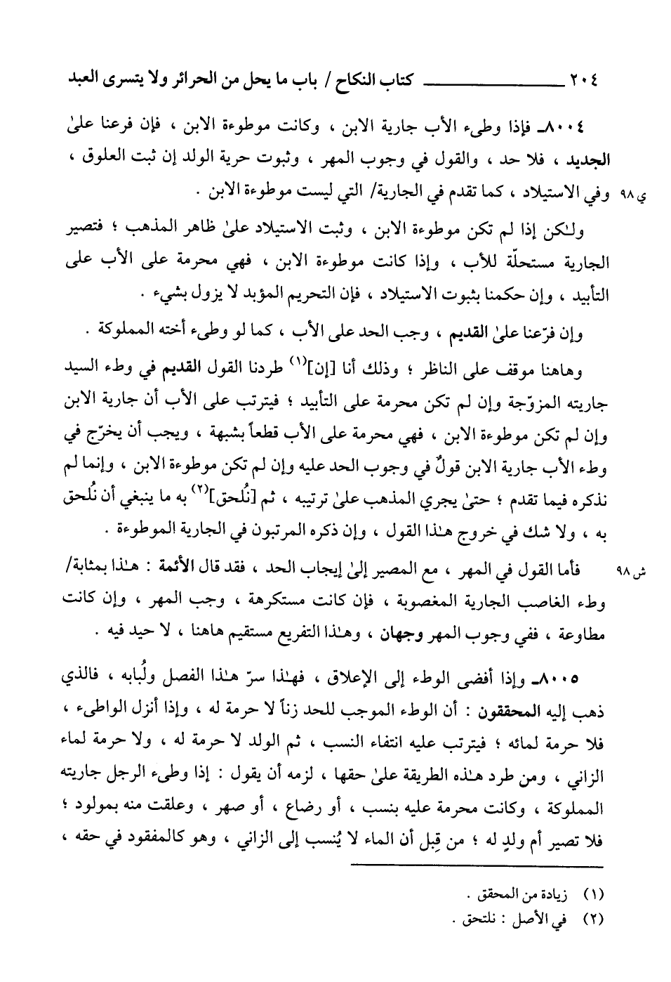 8005 - وإذا أفضى الوطء إلى الإعلاق، فهذا سرّ هذا الفصل ولُبابه، فالذي ذهب إليه المحققون: أن الوطء الموجب للحد زناً لا حرمة له، وإذا أنزل الواطىء، فلا حرمة لمائه؛ فيترتب عليه انتفاء النسب، ثم الولد لا حرمة له، ولا حرمة لماء الزاني، ومن طرد هذه الطريقة على حقها، لزمه أن يقول: إذا وطىء الرجل جاريته المملوكة، وكانت محرمة عليه بنسب، أو رضاع، أو صهر، وعلقت منه بمولود؛ فلا تصير أم ولدٍ له؛ من قِبل أن الماء لا يُنسب إلى الزاني، وهو كالمفقود في حقه،