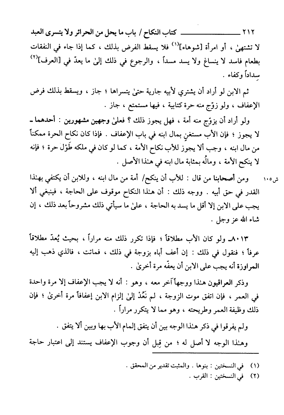 ومن أصحابنا من قال: للأب أن ينكح أمة من مال ابنه، وللابن أن يكتفي بهذا القدر في حق أبيه. ووجه ذلك: أن هذا النكاح موقوف على الحاجة، فينبغي ألا يجب على الابن إلا أقل ما يسد به الحاجة، على ما سيأتي ذلك مشروحاً بعد ذلك، إن شاء الله عز وجل.