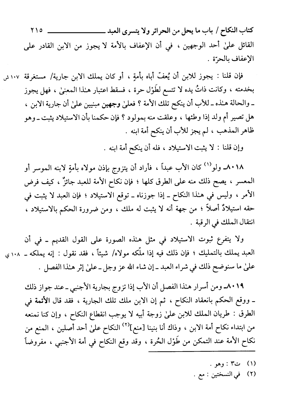 8018 - ولو (1) كان الأب عبداً، فأراد أن يتزوج بإذن مولاه بأمةٍ لابنه الموسر أو المعسر، يصح ذلك منه على الطرق كلها؛ فإن نكاح الأمة للعبد جائزٌ، كيف فرض الأمر، وليس في هذا النكاح -إذا جوزناه- توقع الاستيلاد؛ فإن العبد لا يثبت في حقه استيلادٌ أصلاً؛ من جهة أنه لا يثبت له ملك، ومن ضرورة الحكم بالاستيلاد، انتقال الملك في الرقبة.