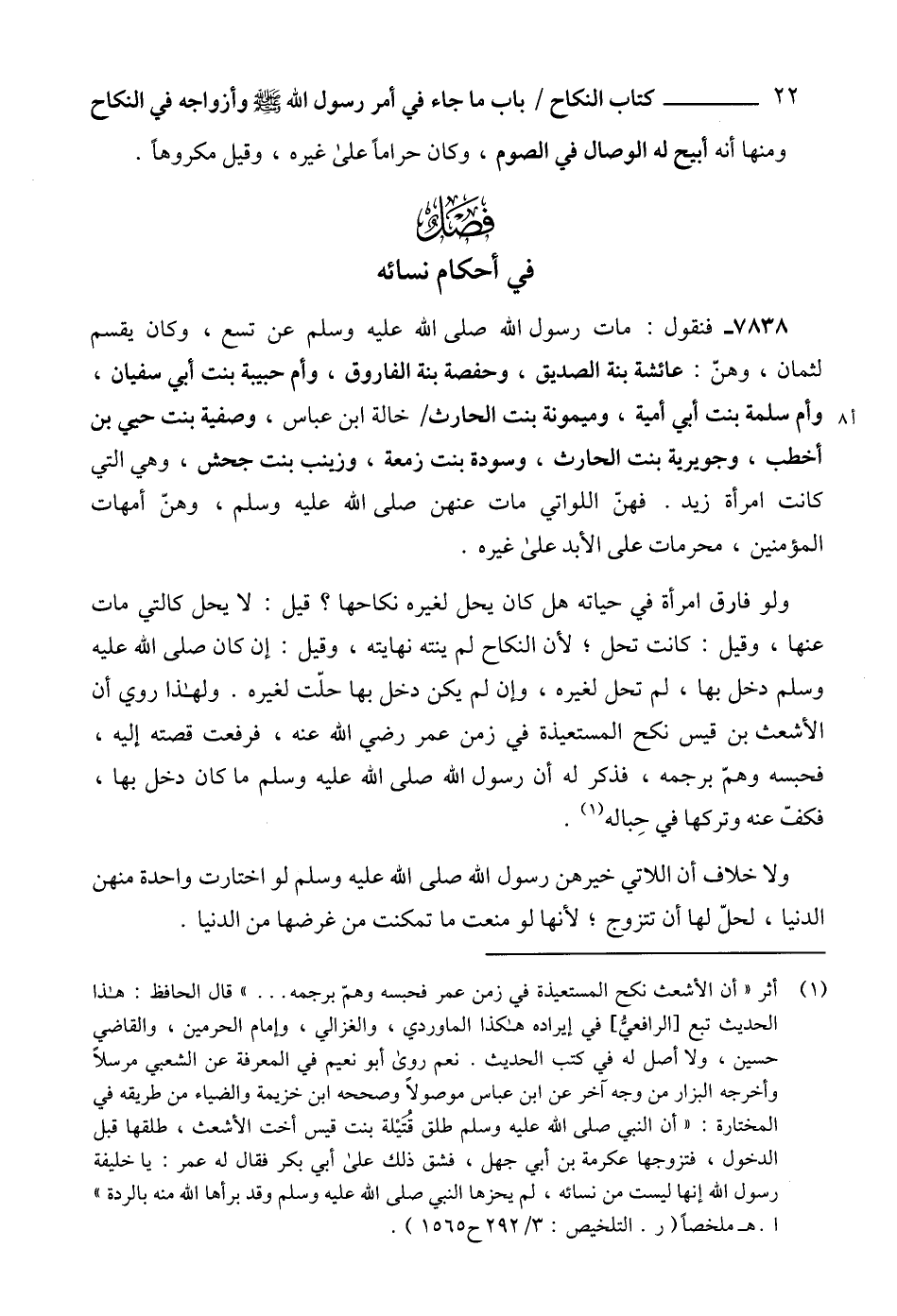 7838 - فنقول: مات رسول الله صلى الله عليه وسلم عن تسع، وكان يقسم لثمان، وهنّ: عائشة بنة الصديق، وحفصة بنة الفاروق، وأم حبيبة بنت أبي سفيان، وأم سلمة بنت أبي أمية، وميمونة بنت الحارث خالة ابن عباس، وصفية بنت حيي بن أخطب، وجويرية بنت الحارث، وسودة بنت زمعة، وزينب بنت جحش، وهي التي كانت امرأة زيد. فهنّ اللواتي مات عنهن صلى الله عليه وسلم، وهنّ أمهات المؤمنين، محرمات على الأبد على غيره.