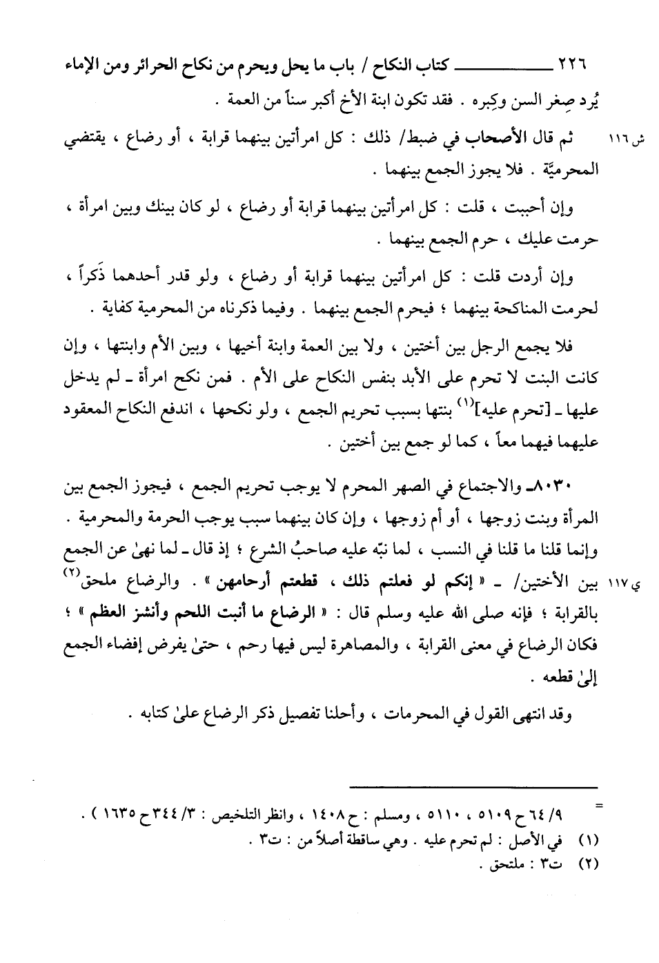 وإنما قلنا ما قلنا في النسب، لما نبّه عليه صاحبُ الشرع؛ إذ قال -لما نهى عن الجمع بين الأختين- "إنكم لو فعلتم ذلك، قطعتم أرحامهن". والرضاع ملحق (2) بالقرابة؛ فإنه صلى الله عليه وسلم قال: "الرضاع ما أنبت اللحم وأنشز العظم"؛ فكان الرضاع في معنى القرابة، والمصاهرة ليس فيها رحم، حتى يفرض إفضاء الجمع إلى قطعه.