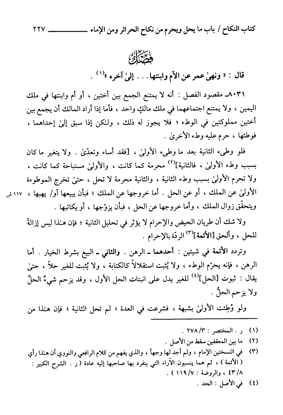 8031 - مقصود الفصل: أنه لا يمتنع الجمع بين أختين، أو أم وابنتها في ملك اليمين، ولا يمتنع اجتماعهما في ملك مالكٍ واحد، فأما إذا أراد المالك أن يجمع بين أختين مملوكتين في الوطء؛ فلا يجوز له ذلك، ولكن إذا سبق إلى إحداهما، فوطئها، حرم عليه وطء الأخرى.