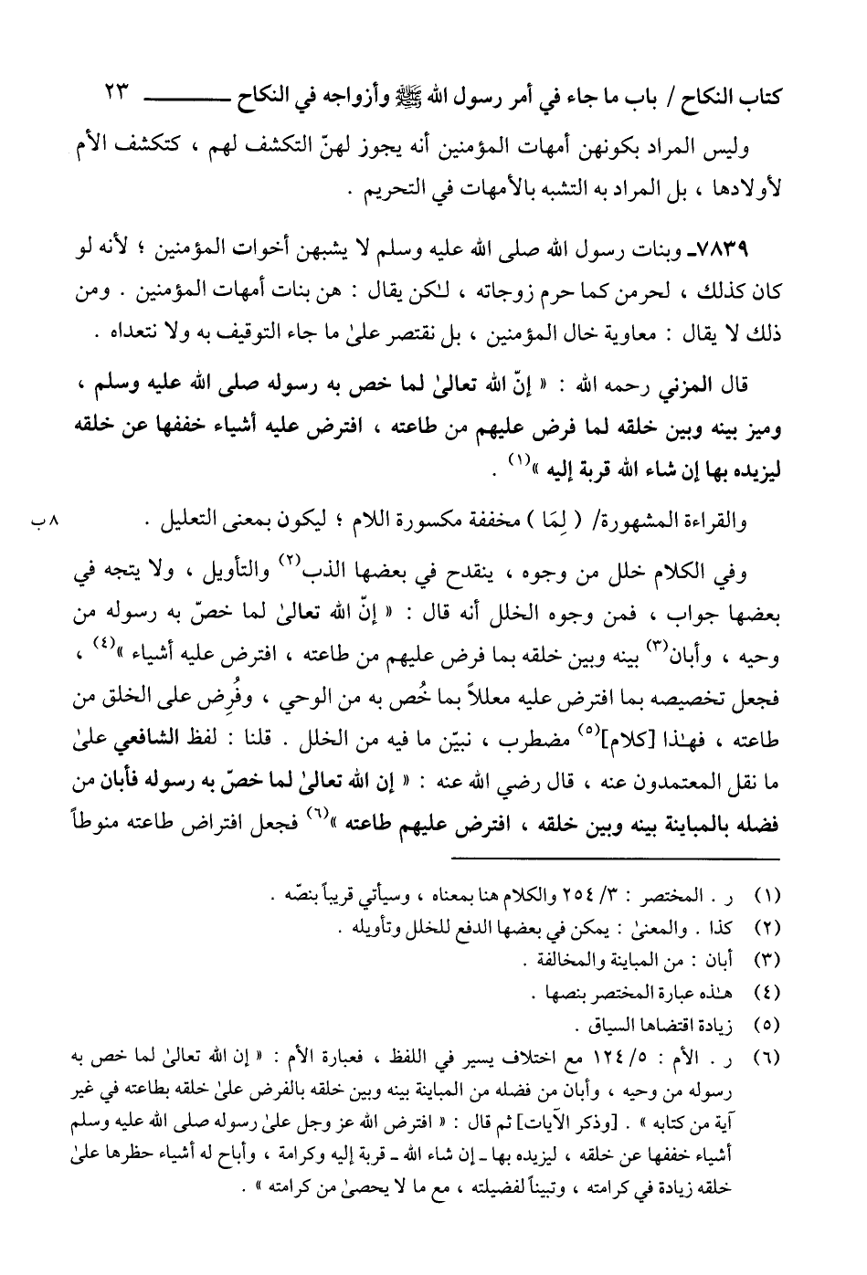 قال المزني رحمه الله: "إنّ الله تعالى لما خص به رسوله صلى الله عليه وسلم، وميز بينه وبين خلقه لما فرض عليهم من طاعته، افترض عليه أشياء خففها عن خلقه ليزيده بها إن شاء الله قربة إليه" (1).