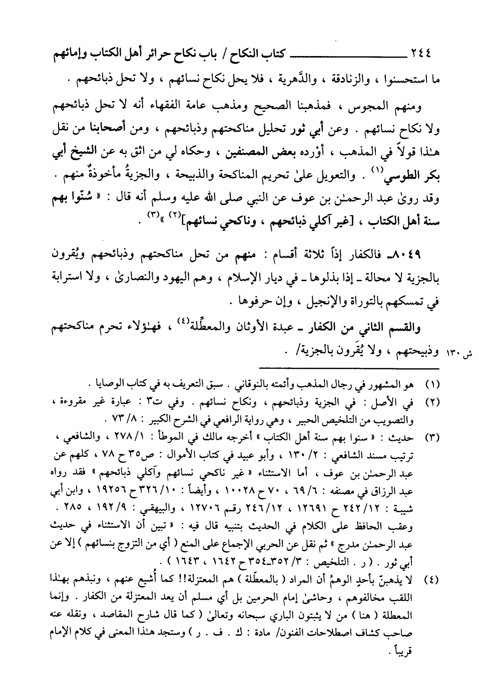 (3) حديث: "سنوا بهم سنة أهل الكتاب" أخرجه مالك في الموطأ: 1/ 278، والشافعي، ترتيب مسند الشافعي: 2/ 130، وأبو عبيد في كتاب الأموال: ص 35 ح 78، كلهم عن عبد الرحمن بن عوف، أما الاستثناء "غير ناكحي نسائهم وآكلي ذبائحهم" فقد رواه عبد الرزاق في مصنفه: 6/ 69، 70 ح 10028، وأيضاًً: 10/ 326 ح 19256، وابن أبي شيبة: 12/ 242 ح 12691، 12/ 246 رقم 12706، والبيهقي: 9/ 192، 285.